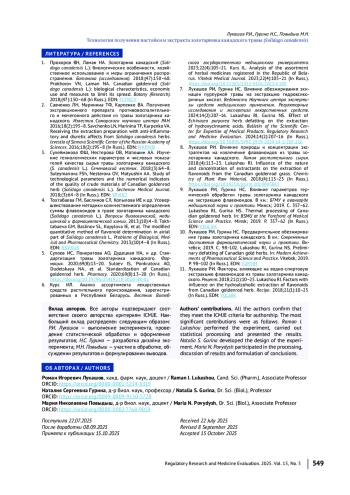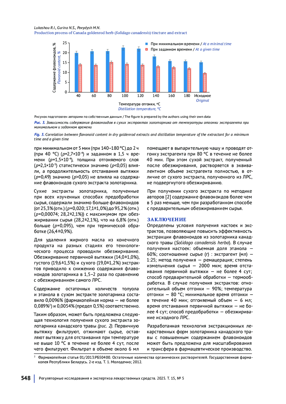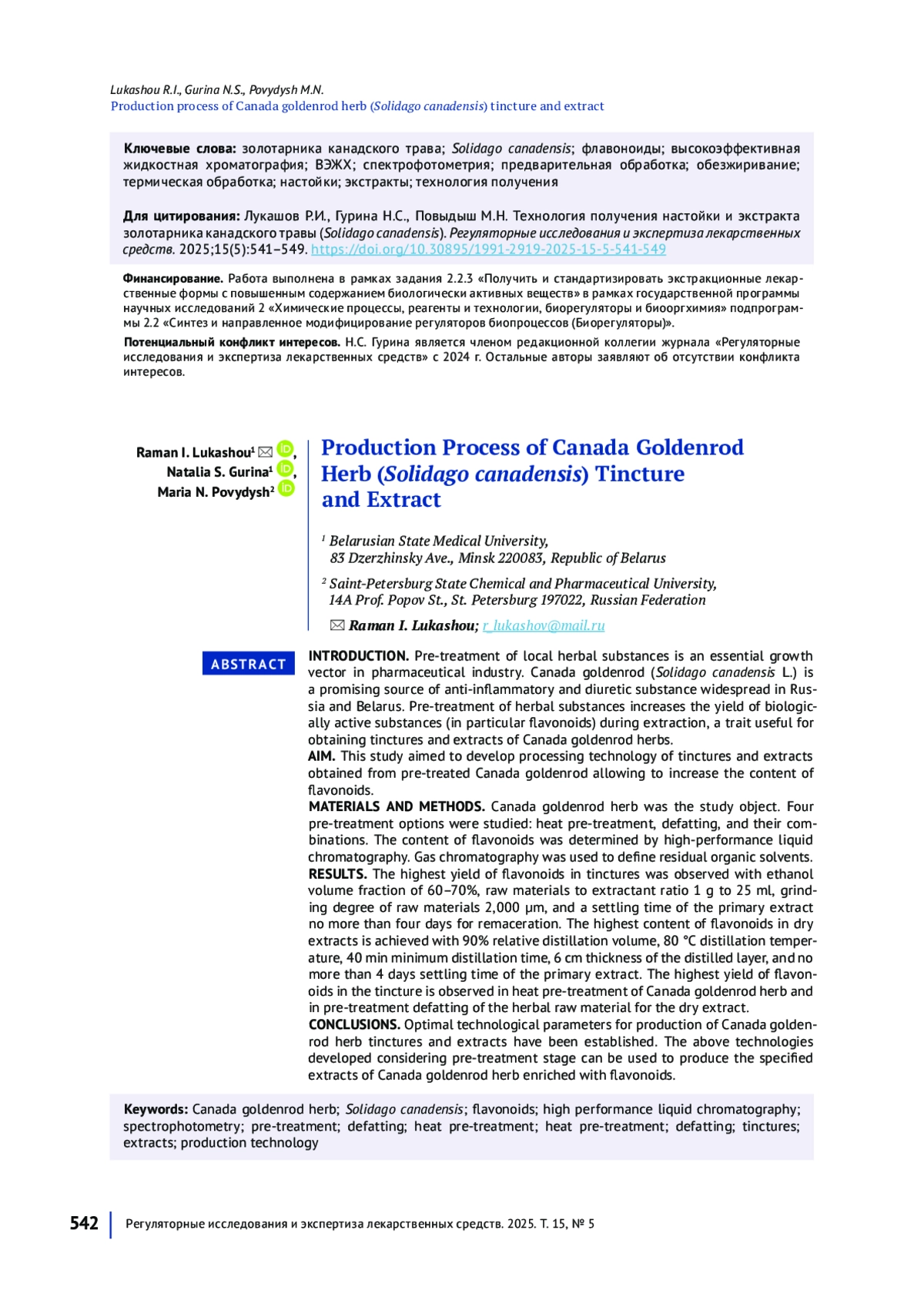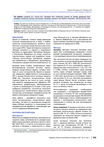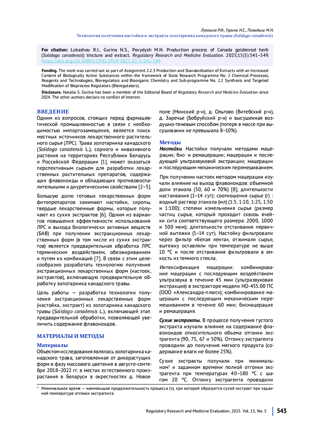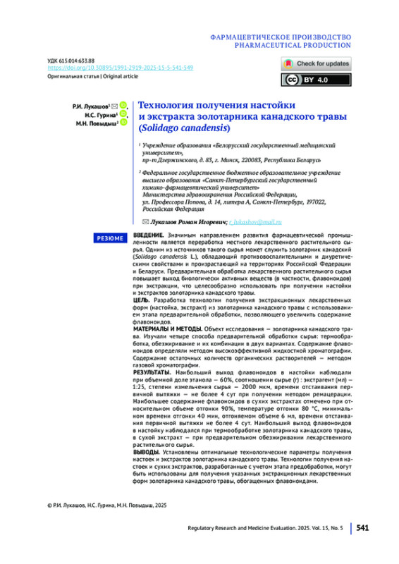 ЛУКАШОВ Р. И., ГУРИНА Н. С., ПОВЫДЫШ М.Н. ТЕХНОЛОГИЯ ПОЛУЧЕНИЯ НАСТОЙКИ И ЭКСТРАКТА ЗОЛОТАРНИКА КАНАДСКОГО ТРАВЫ (SOLIDAGO CANADENSIS) // РЕГУЛЯТОРНЫЕ ИССЛЕДОВАНИЯ И ЭКСПЕРТИЗА ЛЕКАРСТВЕННЫХ СРЕДСТВ. 2025. № 5, ТОМ 15