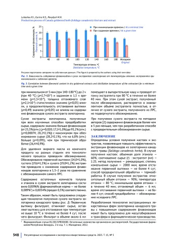 ВЫВОДЫ. Установлены оптимальные технологические параметры получения настоек и экстрактов золотарника канадского травы. Технологии получения настоек и сухих экстрактов, разработанные с учетом этапа предобработки, могут быть использованы для получения указанных экстракционных лекарственных форм золотарника канадского травы, обогащенных флавоноидами.