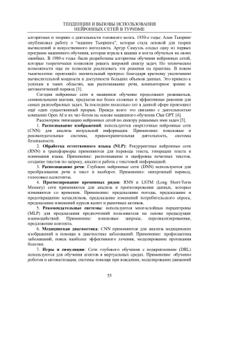 Статья посвящена использованию нейронных сетей в туризме. Рассмотрено, как в сферу туризма активно внедряются инновационные технологии, включая искусственный интеллект и нейронные сети, для улучшения качества услуг и оптимизации бизнес-процессов. Выявлены особенности развития нейронных сетей в туристской сфере. Нейронные сети активно тестируют последние десять лет в основном для сбора и анализа данных. Гибкость и скорость внедрения в других областях современных систем искусственного интеллекта позволяют предположить, что в ближайшем будущем нейронные сети станут неотъемлемой частью туристического бизнеса.
