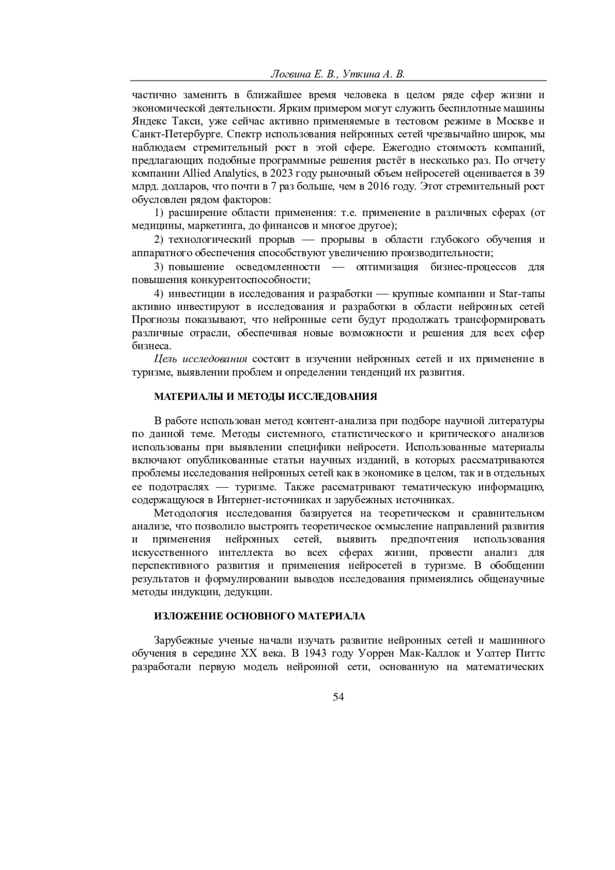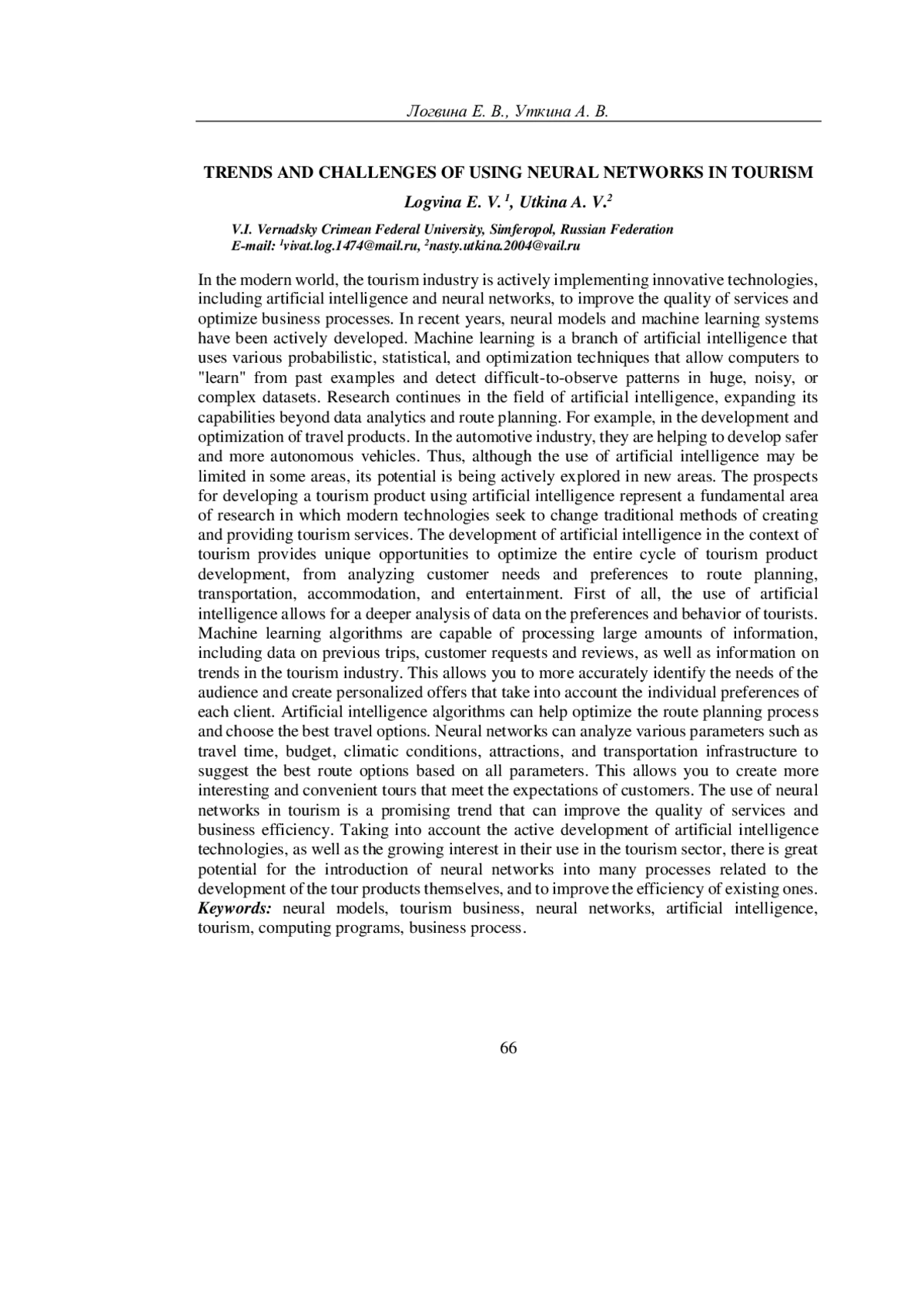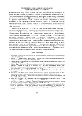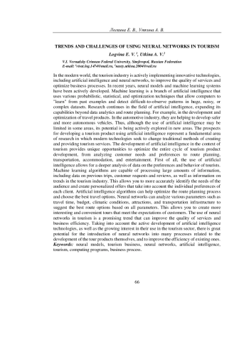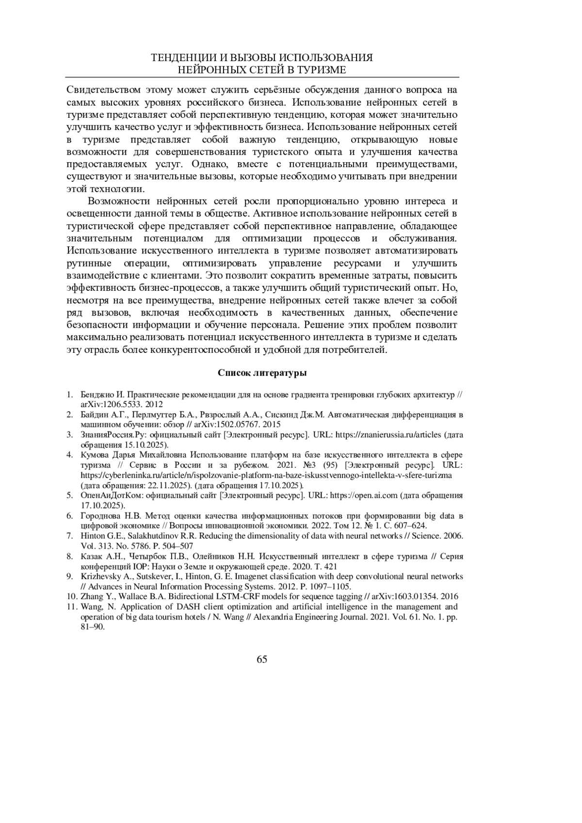 8. Казак А.Н., Четырбок П.В., Олейников Н.Н. Искусственный интеллект в сфере туризма // Серия конференций IOP: Науки о Земле и окружающей среде. 2020. Т. 421.
