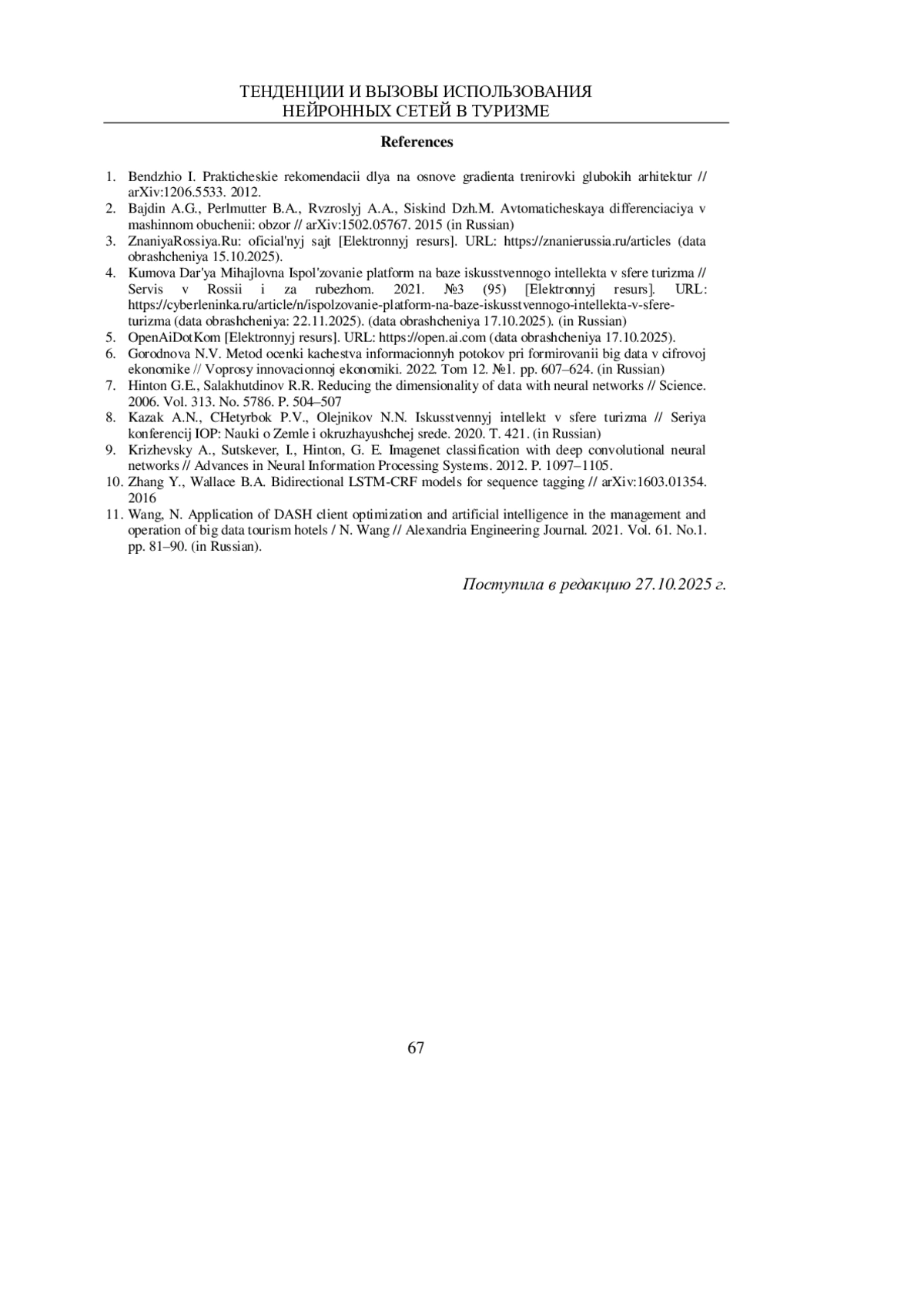 4. Кумова Дарья Михайловна Использование платформ на базе искусственного интеллекта в сфере туризма // Сервис в России и за рубежом. 2021. №3 (95) [Электронный ресурс]. URL: https://cyberleninka.ru/article/n/ispolzovanie-platform-na-baze-iskusstvennogo-intellekta-v-sfere-turizma (дата обращения: 22.11.2025). (дата обращения 17.10.2025).