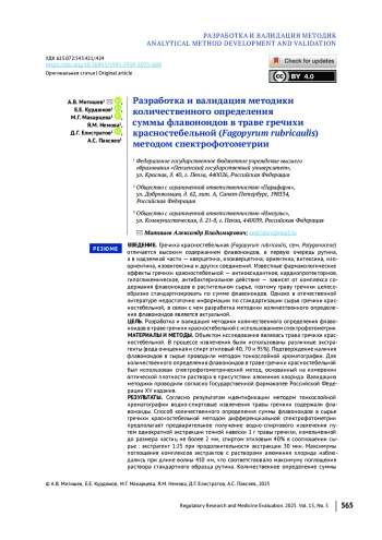 ВВЕДЕНИЕ. Гречиха красностебельная (Fagopyrum rubricaulis, сем. Polygonаceae) отличается высоким содержанием флавоноидов, в первую очередь рутина, а в надземной части — кверцетина, изокверцетина, ориентина, витексина, изоориентина, изовитексина и других соединений. Известные фармакологические эффекты гречихи красностебельной — антиоксидантное, кардиопротекторное, гипогликемическое, антибактериальное действие — зависят от комплекса содержания флавоноидов в растительном сырье, поэтому траву гречихи целесообразно стандартизировать по сумме флавоноидов. Однако в отечественной литературе недостаточно информации по стандартизации сырья гречихи красностебельной, в связи с чем разработка методики количественного определения флавоноидов является актуальной.