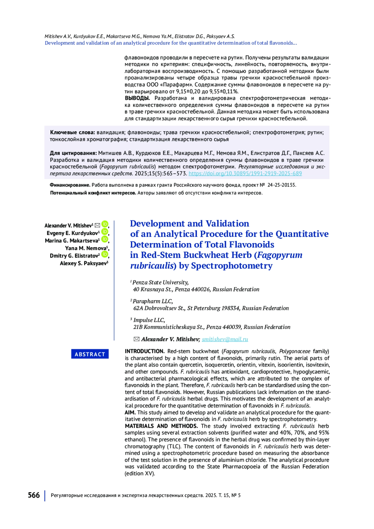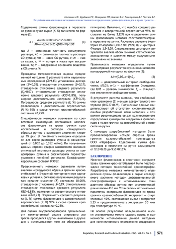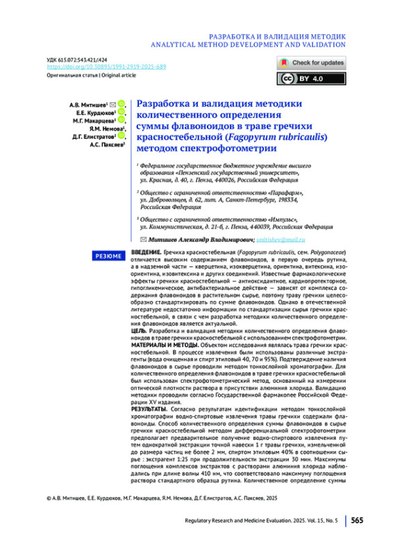 ВЫВОДЫ. Разработана и валидирована спектрофотометрическая методика количественного определения суммы флавоноидов в пересчете на рутин в траве гречихи красностебельной. Данная методика может быть использована для стандартизации лекарственного сырья гречихи красностебельной.
