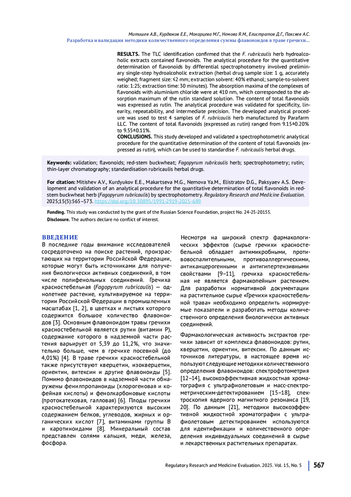 РЕЗУЛЬТАТЫ. Согласно результатам идентификации методом тонкослойной хроматографии водно-спиртовые извлечения травы гречихи содержали флавоноиды. Способ количественного определения суммы флавоноидов в сырье гречихи красностебельной методом дифференциальной спектрофотометрии предполагает предварительное получение водно-спиртового извлечения путем однократной экстракции точной навески 1 г травы гречихи, измельченной до размера частиц не более 2 мм, спиртом этиловым 40% в соотношении сырье: экстрагент 1:25 при продолжительности экстракции 30 мин. Максимумы поглощения комплексов экстрактов с растворами алюминия хлорида наблюдались при длине волны 410 нм, что соответствовало максимуму поглощения раствора стандартного образца рутина. Количественное определение суммы флавоноидов проводили в пересчете на рутин. Получены результаты валидации методики по критериям: специфичность, линейность, повторяемость, внутрилабораторная воспроизводимость. С помощью разработанной методики были проанализированы четыре образца травы гречихи красностебельной производства ООО «Парафарм». Содержание суммы флавоноидов в пересчете на рутин варьировало от 9,15±0,20 до 9,55±0,11%.