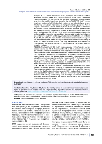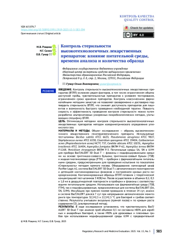 ВВЕДЕНИЕ. Контроль стерильности высокотехнологичных лекарственных препаратов (ВТЛП) осложнен рядом факторов, в том числе: ограничением объема доступной пробы, чувствительностью препаратов к условиям тестирования, ограничением срока хранения препаратов. Контроль классическими фармакопейными методами зачастую не позволяет своевременно и достоверно подтвердить стерильность ВТЛП, что снижает доступность препаратов для пациентов и возможность быстрого проведения необходимой терапии. Повысить скорость и эффективность проведения контроля стерильности можно путем разработки альтернативных ускоренных микробиологических методик, учитывающих специфику ВТЛП.
