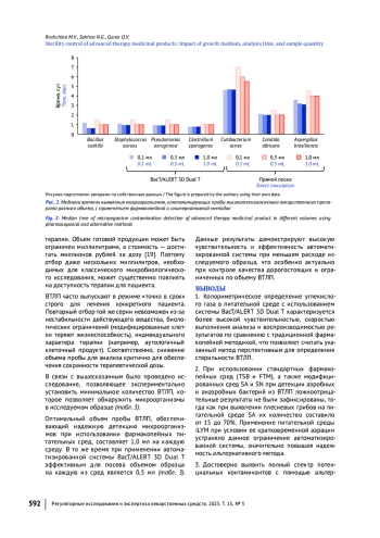 МАТЕРИАЛЫ И МЕТОДЫ. Объект исследования — образец высокотехнологичного лекарственного генотерапевтического препарата. Используемые тест-штаммы: Bacillus subtilis ATCC 6633, Pseudomonas aeruginosa ATСС 9027, Staphylococcus aureus ATCC 6538, Clostridium sporogenes ATCC 19404, Cutibacterium acnes (Propionibacterium acnes) NCTC 737, Candida albicans АТСС 10231, Aspergillus brasiliensis АТСС 16404, Aspergillus fumigatus ВКПМ F-62, Aspergillus terreus ВКПМ F-1269, Penicillium chrysogenum ВКПМ F-3. Питательные среды: SA, SN и iLYM для прибора BacT/ALERT 3D Dual T — флаконы с модифицированными средами на основе триптиказо-соевого бульона; триптиказо-соевый бульон (TSB) и жидкая тиогликолевая среда (FTM) — пробирки с фармакопейными питательными средами, предусмотренными для проведения испытания по показателю «Стерильность» методом прямого посева. Оборудование: ламинарный шкаф Purifier Logic A2, система BacT/ALERT 3D Dual T с автоматическим мониторингом и детекцией контаминированных флаконов и построением кривых роста микроорганизмов. Контаминированные образцы ВТЛП готовили с теоретической концентрацией тест-штаммов 3 КОЕ/мл. Посев осуществляли в объемах 0,1; 0,5 и 1,0 мл в двадцатикратной повторности в пробирки и флаконы с соответствующими питательными средами. Использовали как фармакопейные среды (TSB, FTM), так и модифицированные, предназначенные для системы BacT/ALERT (SA, SN, iLYM). Инкубацию при прямом посеве проводили в течение 14 сут; анализ в системе BacT/ALERT длился 7 сут при непрерывном автоматическом мониторинге при температурах 32,5±2,5 и 22,5±2,5 °С для бактерий и грибов соответственно. Результаты учитывали визуально (прямой посев) и по кривым роста содержания CO2 (альтернативный метод).