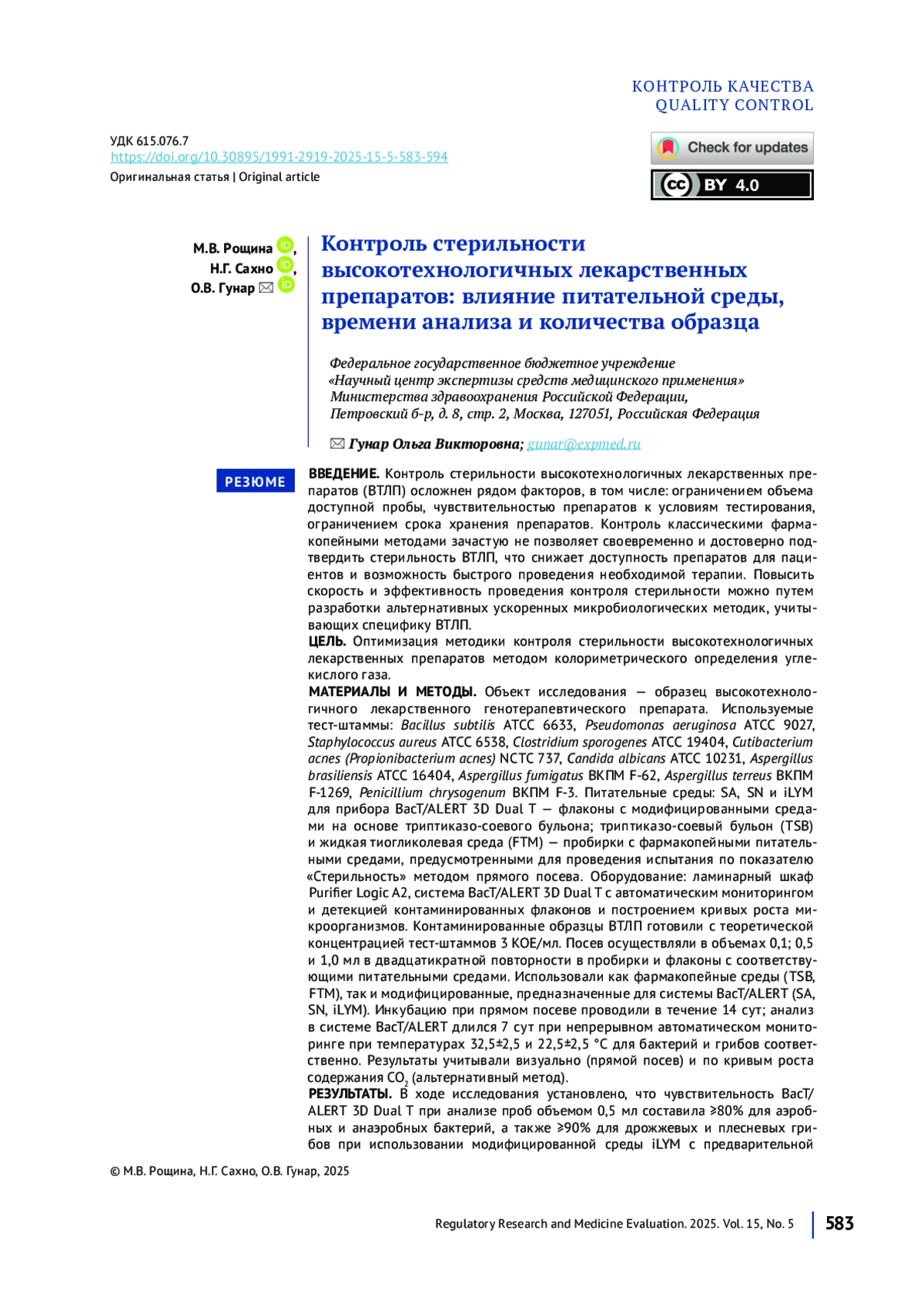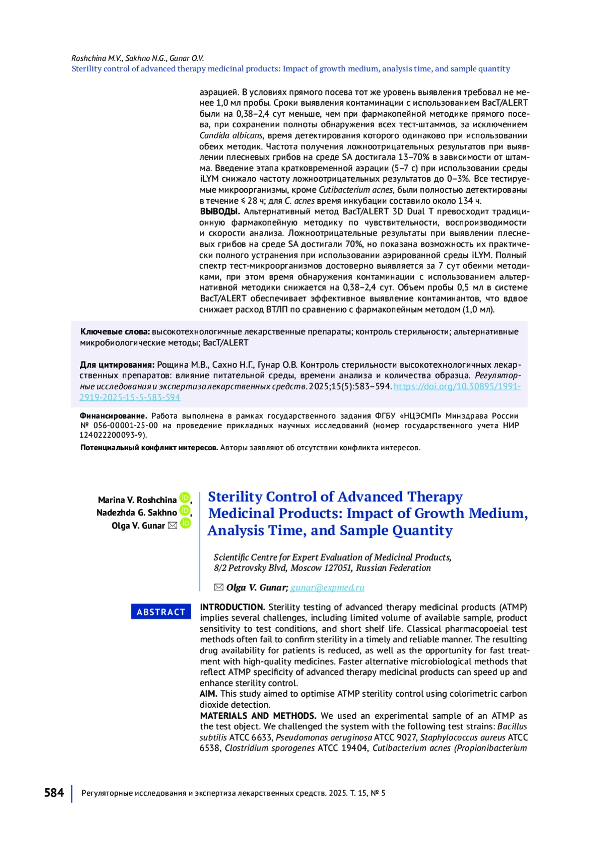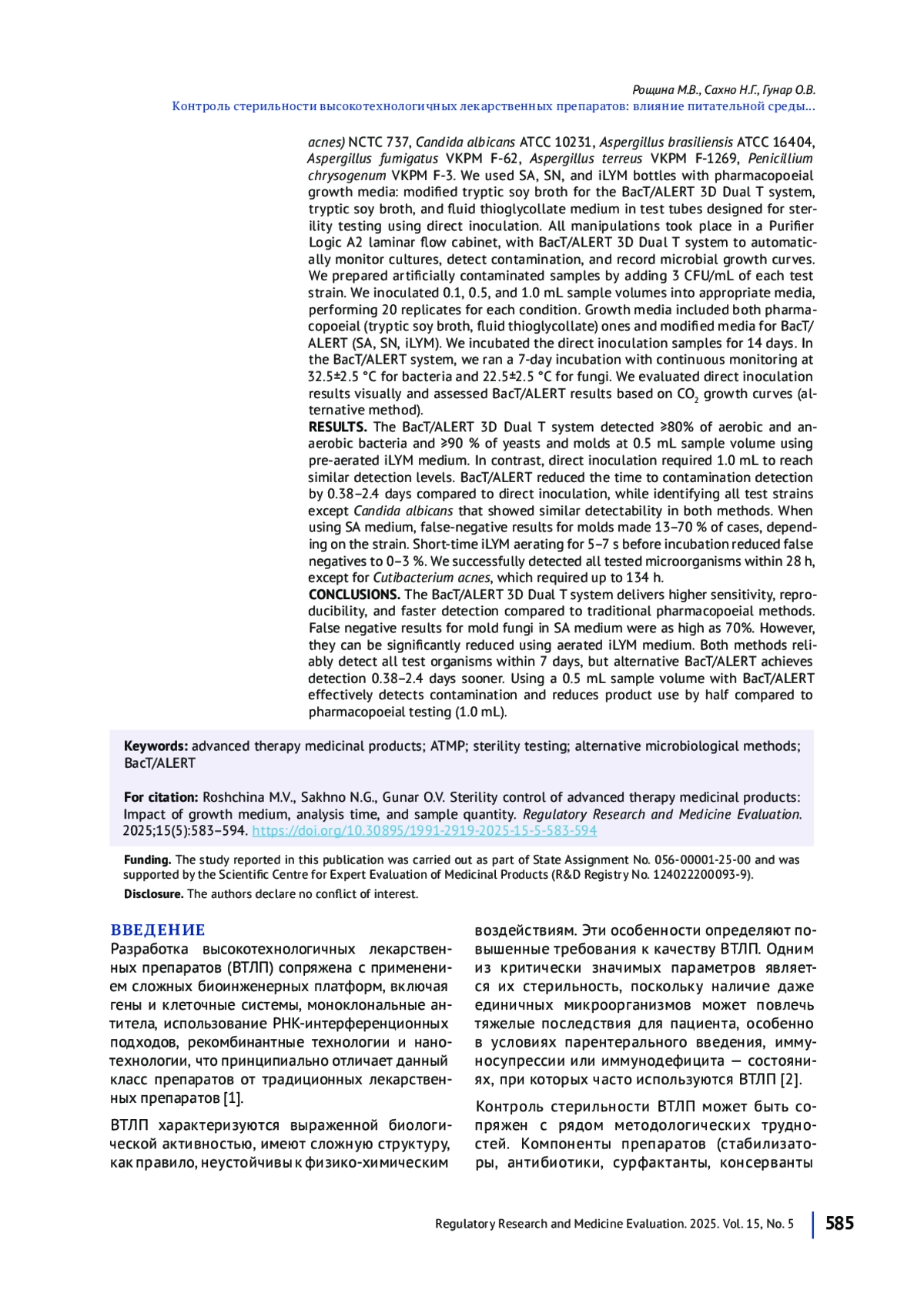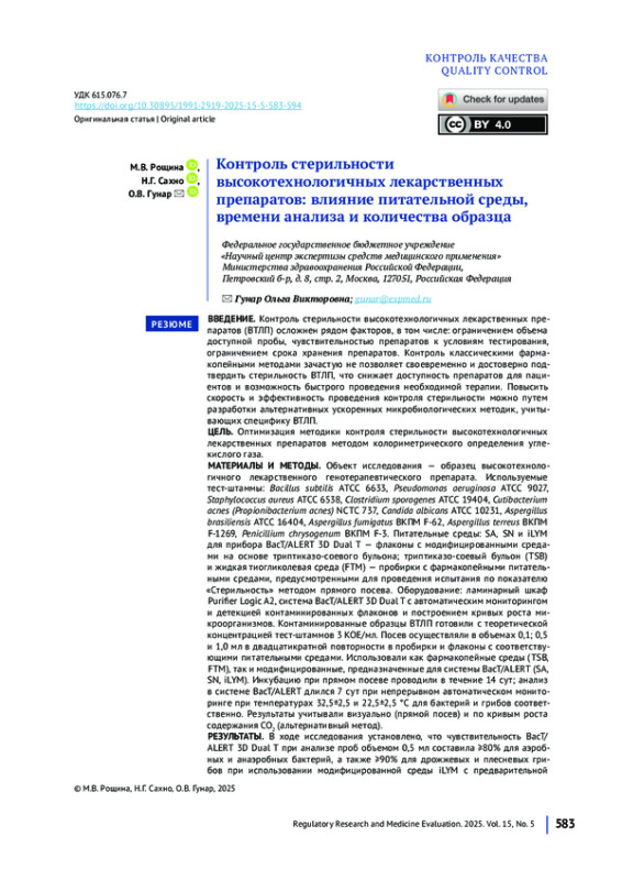 7. Рощина МВ, Сахно НГ, Гунар ОВ. Подходы к валидации альтернативной методики определения стерильности высокотехнологичных лекарственных препаратов. Химико фармацевтический журнал. 2025;59(2):58-64. DOI: 10.30906/0023-1134-2025-59-2-58-64