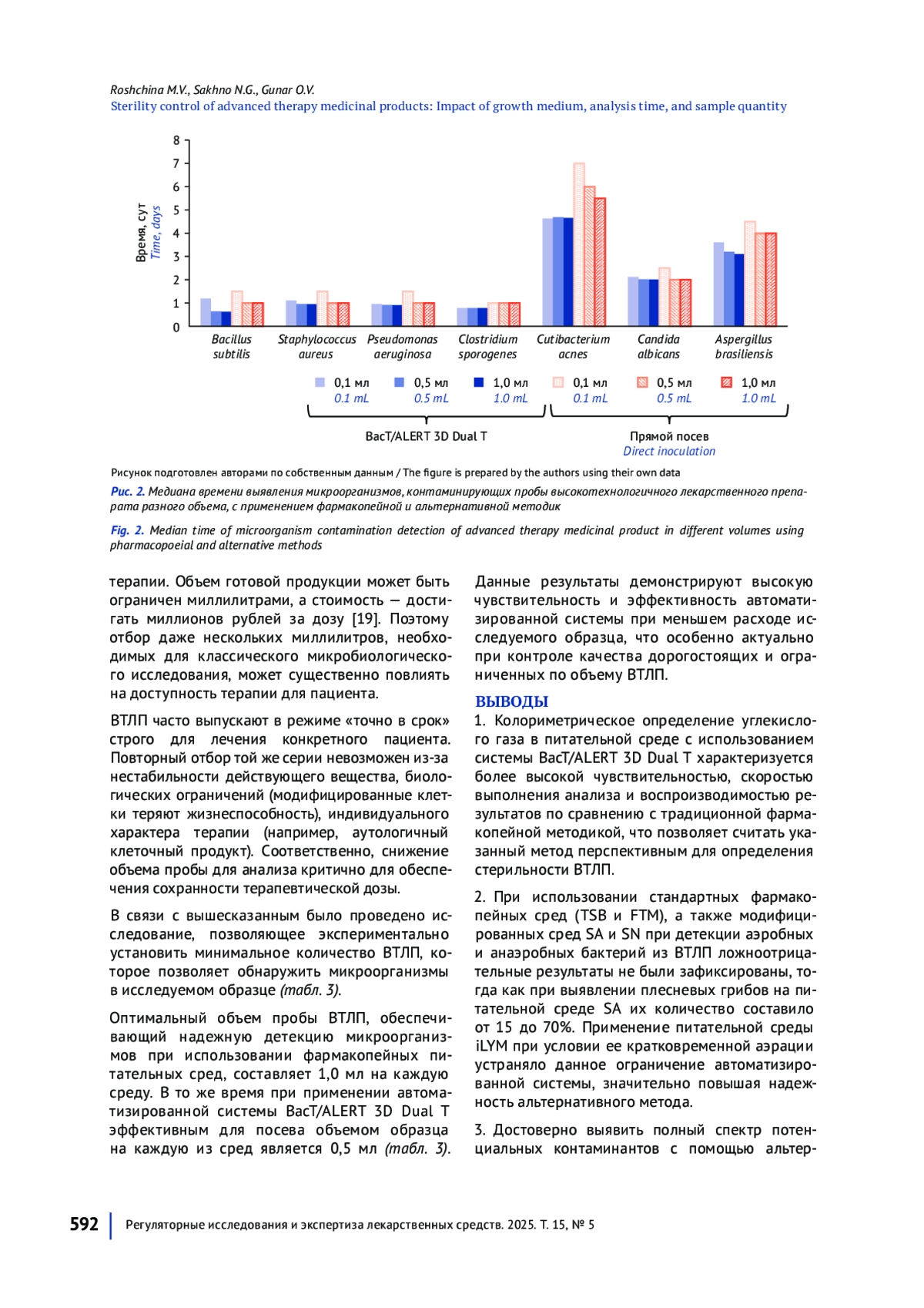 ВЫВОДЫ. Альтернативный метод BacT/ALERT 3D Dual T превосходит традиционную фармакопейную методику по чувствительности, воспроизводимости и скорости анализа. Ложноотрицательные результаты при выявлении плесневых грибов на среде SA достигали 70%, но показана возможность их практически полного устранения при использовании аэрированной среды iLYM. Полный спектр тест-микроорганизмов достоверно выявляется за 7 сут обеими методиками, при этом время обнаружения контаминации с использованием альтернативной методики снижается на 0,38–2,4 сут. Объем пробы 0,5 мл в системе BacT/ALERT обеспечивает эффективное выявление контаминантов, что вдвое снижает расход ВТЛП по сравнению с фармакопейным методом (1,0 мл).