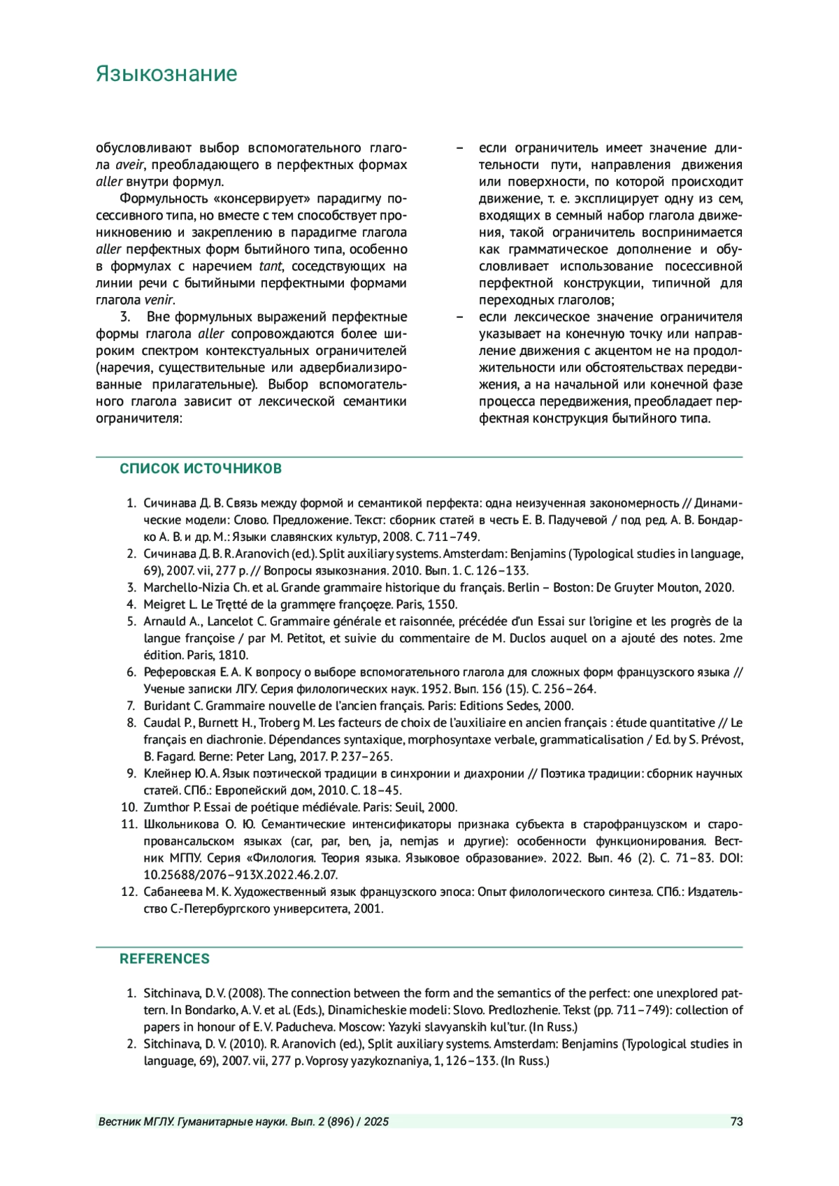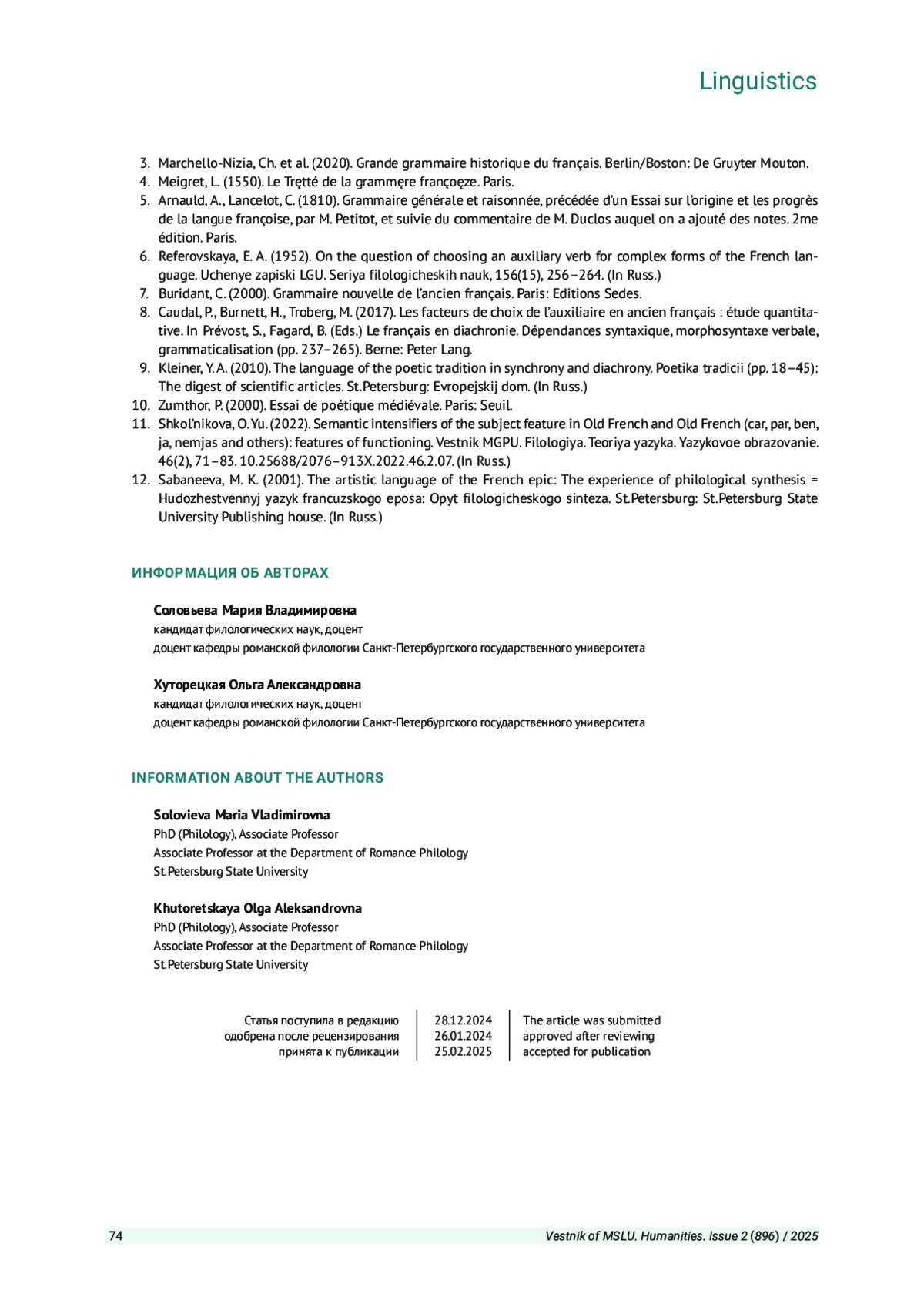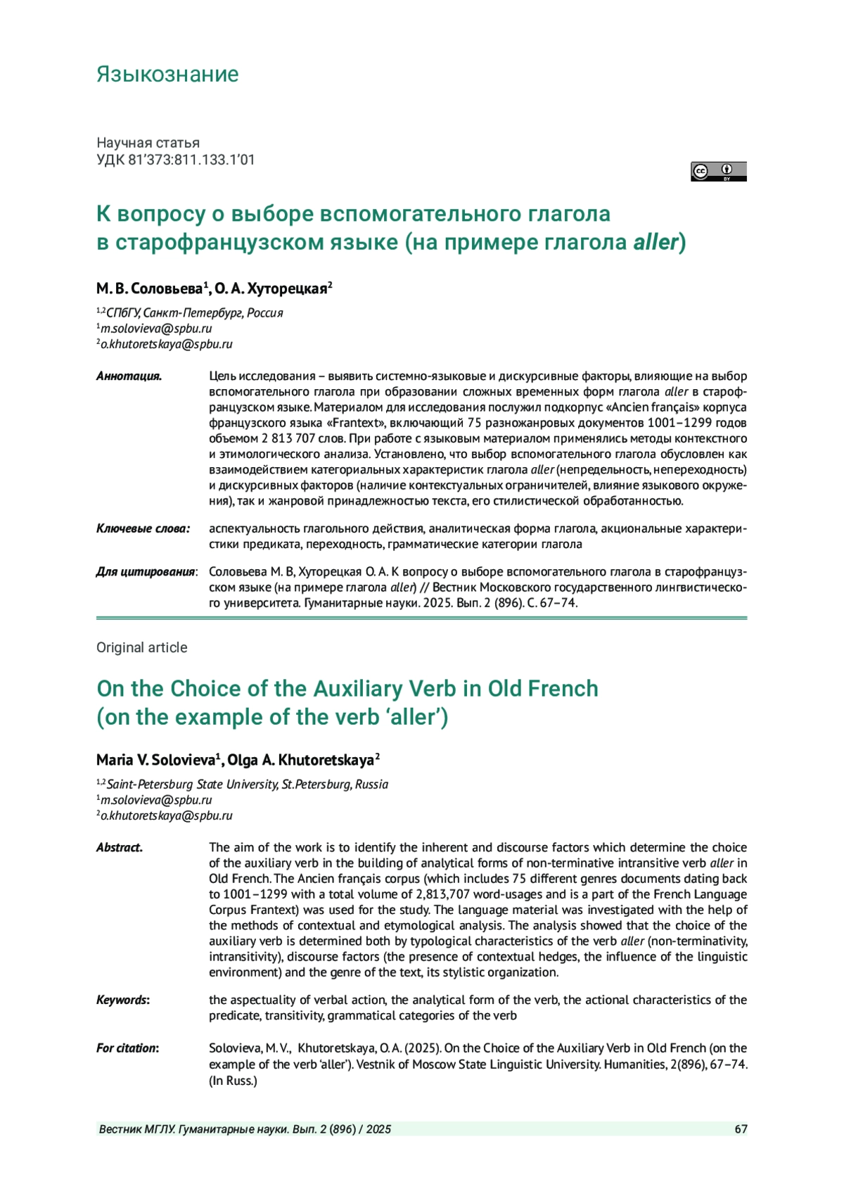 СОЛОВЬЕВА М. В., ХУТОРЕЦКАЯ О. А. К ВОПРОСУ О ВЫБОРЕ ВСПОМОГАТЕЛЬНОГО ГЛАГОЛА В СТАРОФРАНЦУЗСКОМ ЯЗЫКЕ (НА ПРИМЕРЕ ГЛАГОЛА ALLER) // ВЕСТНИК МОСКОВСКОГО ГОСУДАРСТВЕННОГО ЛИНГВИСТИЧЕСКОГО УНИВЕРСИТЕТА. ГУМАНИТАРНЫЕ НАУКИ. 2025. № 2 (896)
