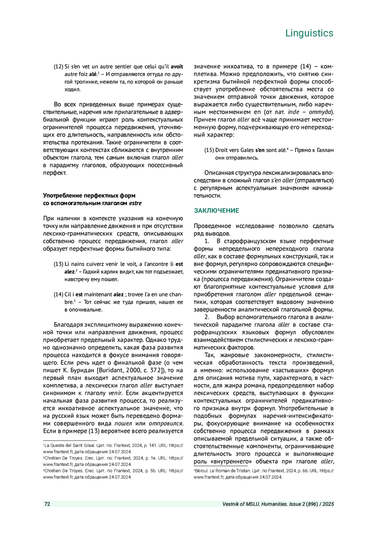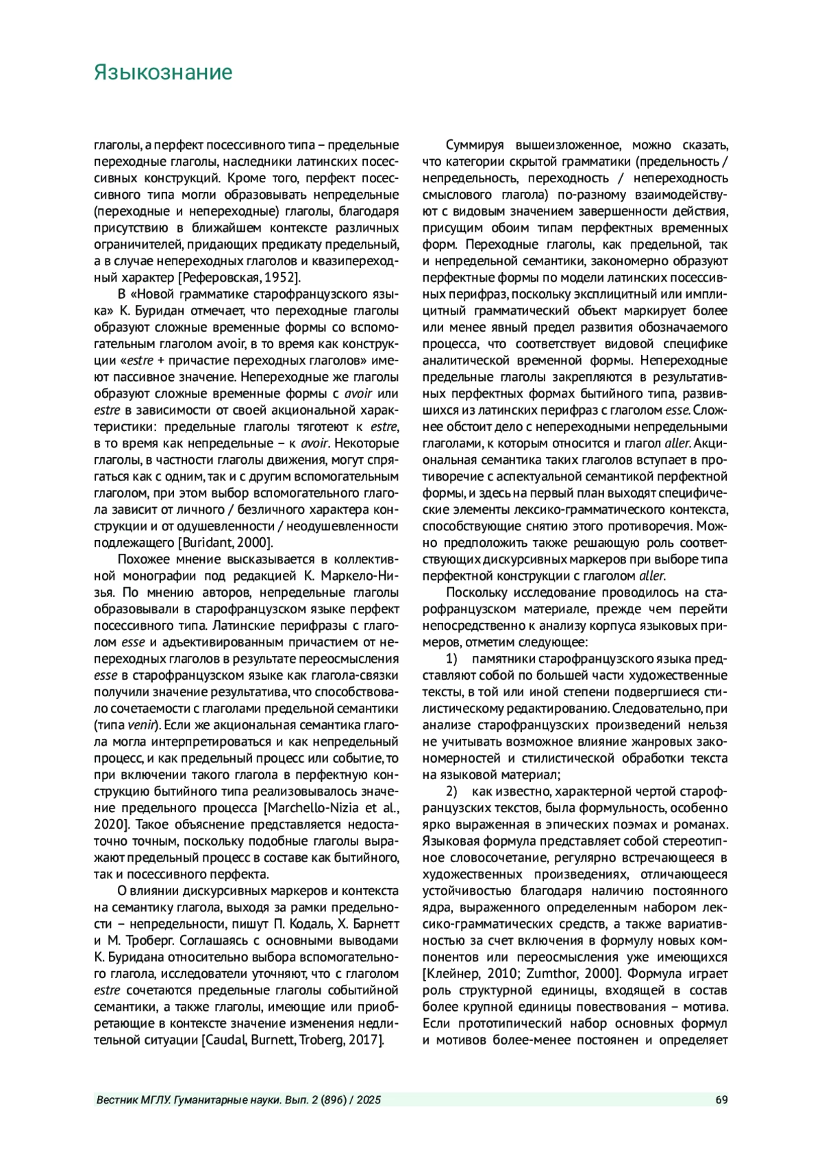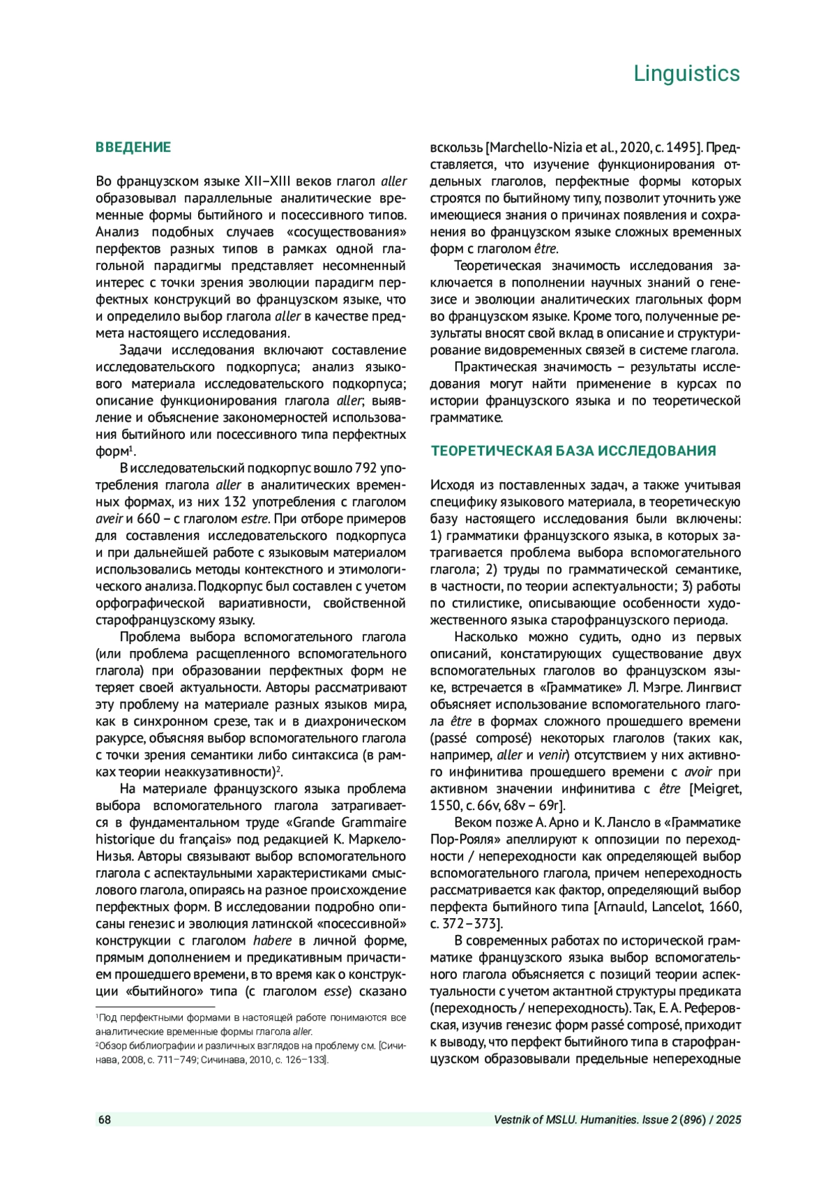 СОЛОВЬЕВА М. В., ХУТОРЕЦКАЯ О. А. К ВОПРОСУ О ВЫБОРЕ ВСПОМОГАТЕЛЬНОГО ГЛАГОЛА В СТАРОФРАНЦУЗСКОМ ЯЗЫКЕ (НА ПРИМЕРЕ ГЛАГОЛА ALLER) // ВЕСТНИК МОСКОВСКОГО ГОСУДАРСТВЕННОГО ЛИНГВИСТИЧЕСКОГО УНИВЕРСИТЕТА. ГУМАНИТАРНЫЕ НАУКИ. 2025. № 2 (896)