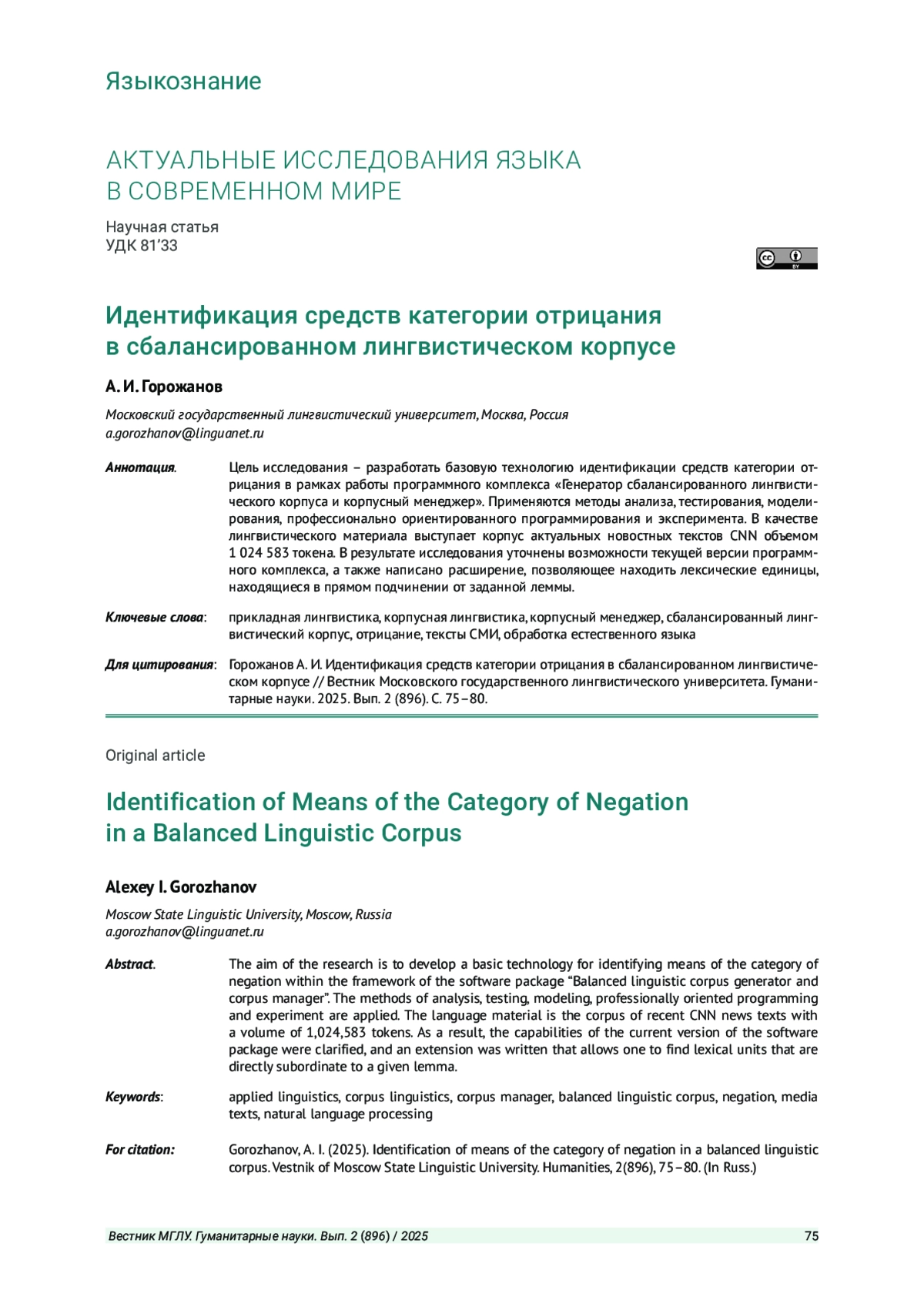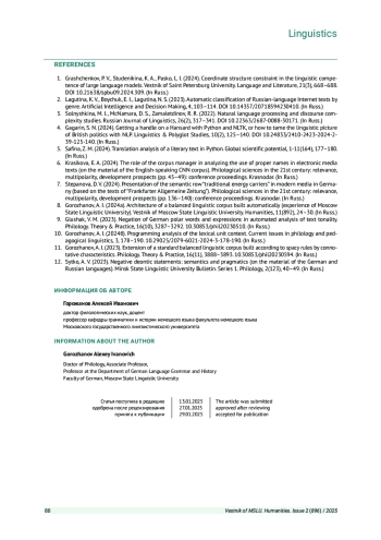 8. Горожанов А. И. Архитектура сбалансированного лингвистического корпуса, полученного автоматическим путем (опыт Московского государственного лингвистического университета) // Вестник Московского государственного лингвистического университета. Гуманитарные науки. 2024а. № 11 (892). С. 24-30. EDN: BCSCXQ