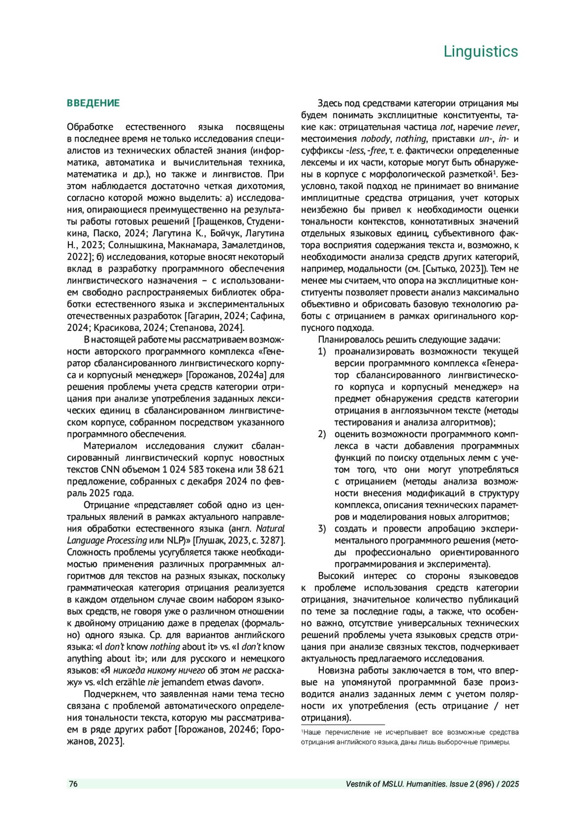 Цель исследования - разработать базовую технологию идентификации средств категории отрицания в рамках работы программного комплекса «Генератор сбалансированного лингвистического корпуса и корпусный менеджер». Применяются методы анализа, тестирования, моделирования, профессионально ориентированного программирования и эксперимента. В качестве лингвистического материала выступает корпус актуальных новостных текстов CNN объемом 1 024 583 токена. В результате исследования уточнены возможности текущей версии программного комплекса, а также написано расширение, позволяющее находить лексические единицы, находящиеся в прямом подчинении от заданной леммы.