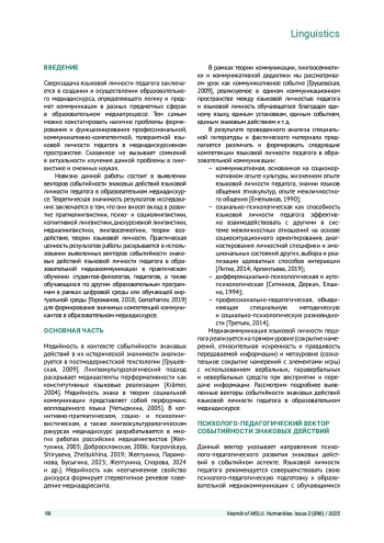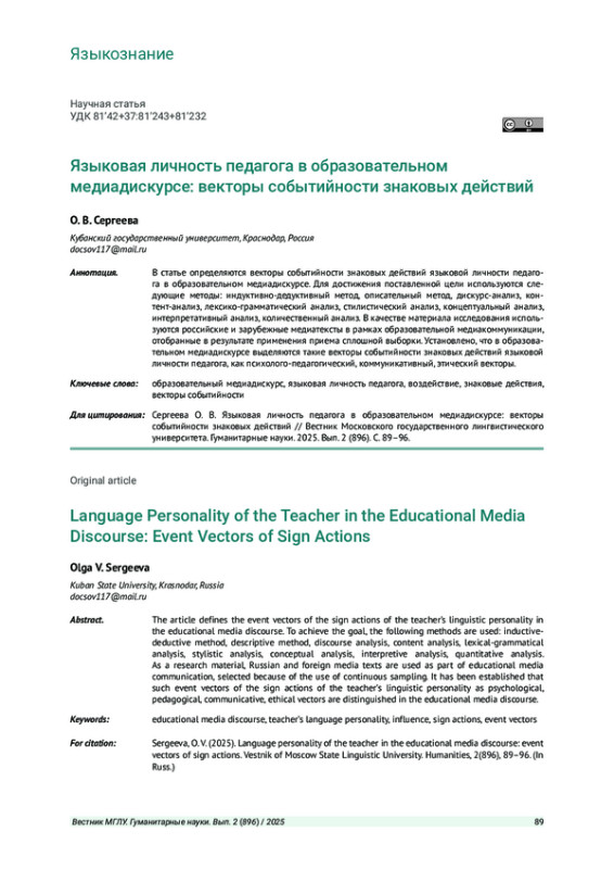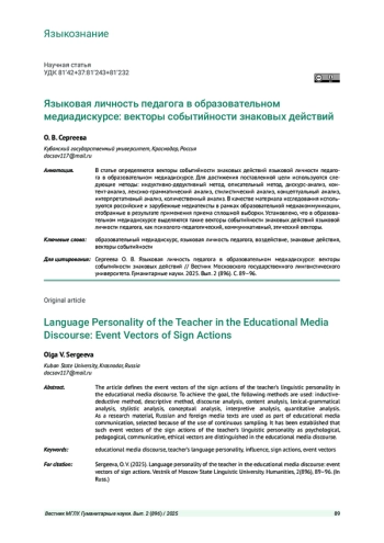 В статье определяются векторы событийности знаковых действий языковой личности педагога в образовательном медиадискурсе. Для достижения поставленной цели используются следующие методы: индуктивно-дедуктивный метод, описательный метод, дискурс-анализ, контент-анализ, лексико-грамматический анализ, стилистический анализ, концептуальный анализ, интерпретативный анализ, количественный анализ. В качестве материала исследования используются российские и зарубежные медиатексты в рамках образовательной медиакоммуникации, отобранные в результате применения приема сплошной выборки. Установлено, что в образовательном медиадискурсе выделяются такие векторы событийности знаковых действий языковой личности педагога, как психолого-педагогический, коммуникативный, этический векторы.