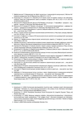 1. Горожанов А. И. Формирование обучающей виртуальной среды в контексте новых информационных технологий: дис. … д-ра филол. наук. М, 2018. EDN: BDNFAR