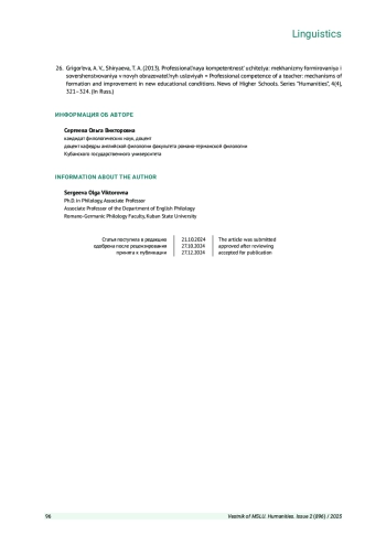 26. Григорьева А. В., Ширяева Т. А. Профессиональная компетентность учителя: механизмы формирования и совершенствования в новых образовательных условиях // Известия высших учебных заведений. Серия: Гуманитарные науки. 2013. Т. 4. № 4. С. 321-324. EDN: RPYLMF