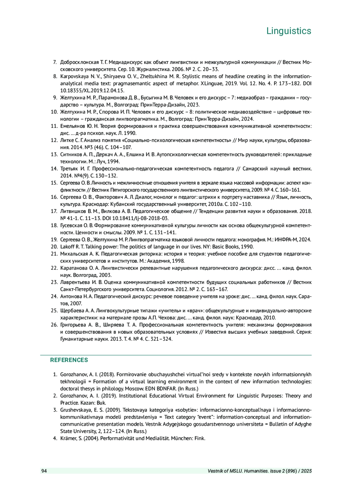 2. Gorozhanov A. I. Institutional Educational Virtual Environment for Linguistic Purposes: Theory and Practice. Казань: Бук, 2019. EDN: ZSBXTF