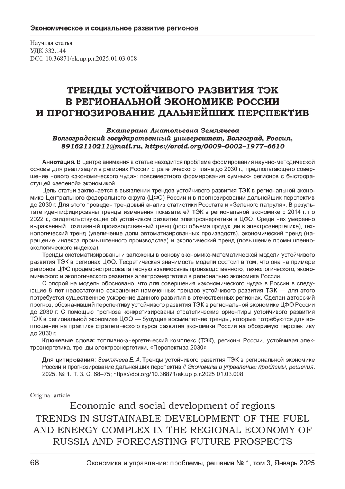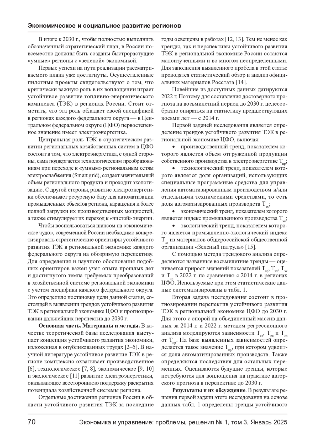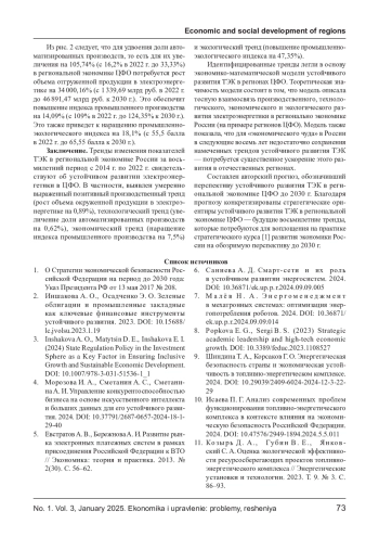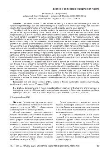 Цель статьи заключается в выявлении трендов устойчивого развития ТЭК в региональной экономике Центрального федерального округа (ЦФО) России и в прогнозировании дальнейших перспектив до 2030 г. Для этого проведен трендовый анализ статистики Росстата и «Зеленого патруля». В результате идентифицированы тренды изменения показателей ТЭК в региональной экономике с 2014 г. по 2022 г., свидетельствующие об устойчивом развитии электроэнергетики в ЦФО. Среди них умеренно выраженный позитивный производственный тренд (рост объема продукции в электроэнергетике), технологический тренд (увеличение доли автоматизированных производств), экономический тренд (наращение индекса промышленного производства) и экологический тренд (повышение промышленно- экологического индекса). Тренды систематизированы и заложены в основу экономико- математической модели устойчивого развития ТЭК в регионах ЦФО. Теоретическая значимость модели состоит в том, что она на примере регионов ЦФО продемонстрировала тесную взаимосвязь производственного, технологического, экономического и экологического развития электроэнергетики в регионально экономике России. С опорой на модель обосновано, что для совершения «экономического чуда» в России в следующие 8 лет недостаточно сохранения намеченных трендов устойчивого развития ТЭК - для этого потребуется существенное ускорение данного развития в отечественных регионах. Сделан авторский прогноз, обозначивший перспективу устойчивого развития ТЭК в региональной экономике ЦФО России до 2030 г. С помощью прогноза конкретизированы стратегические ориентиры устойчивого развития ТЭК в региональной экономике ЦФО - будущие восьмилетние тренды, которые потребуются для воплощения на практике стратегического курса развития экономики России на обозримую перспективу до 2030 г.