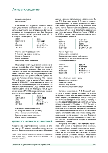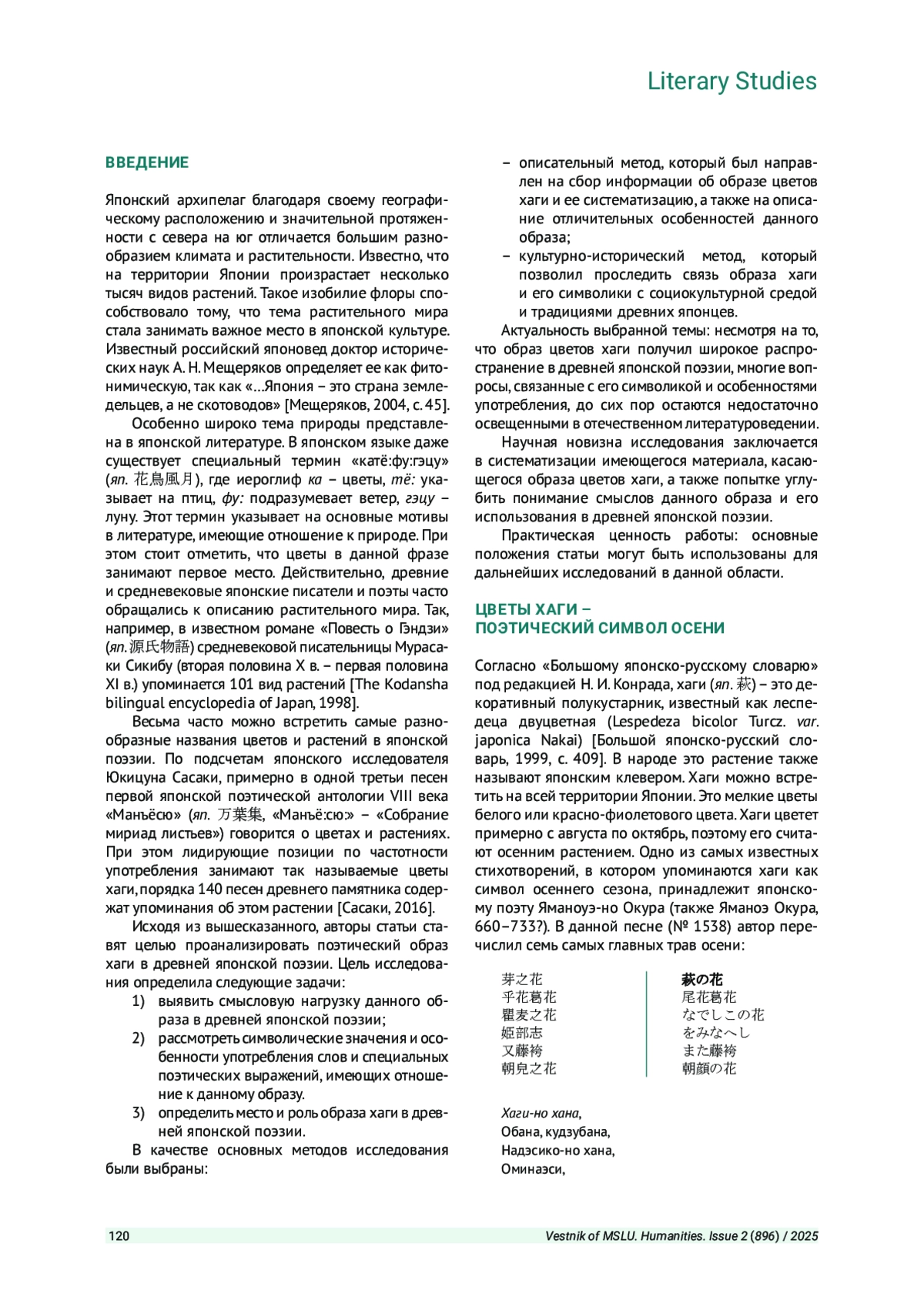 Статья: ЦВЕТЫ ХАГИ КАК НАИБОЛЕЕ РАСПРОСТРАНЕННОЕ НАЗВАНИЕ РАСТЕНИЙ В ДРЕВНЕЙ ЯПОНСКОЙ ПОЭЗИИ (2025)