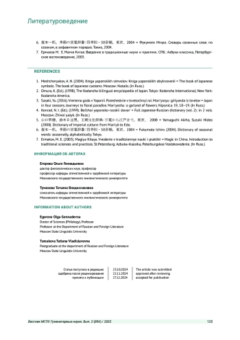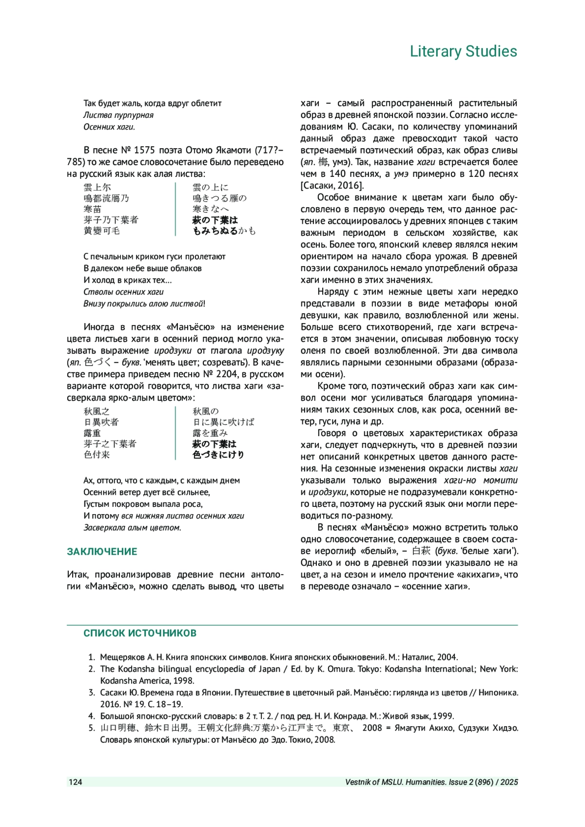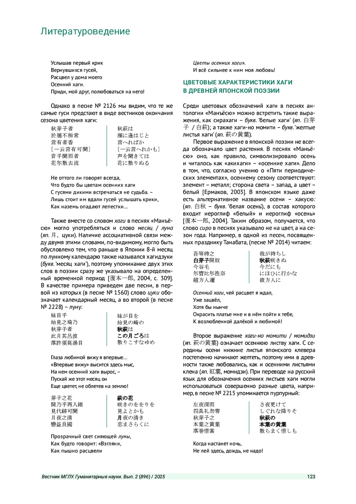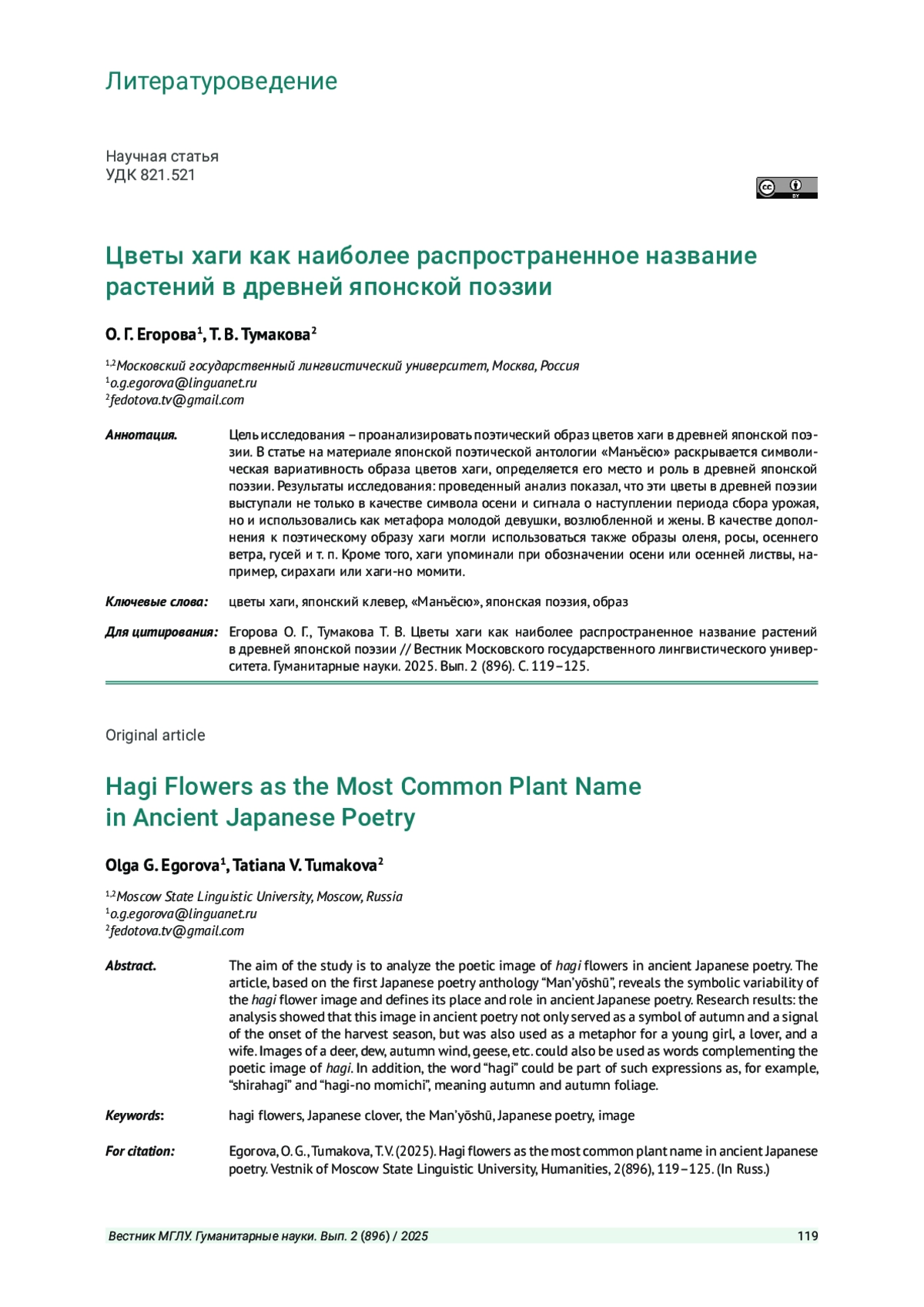 ЕГОРОВА О. Г., ТУМАКОВА Т. В. ЦВЕТЫ ХАГИ КАК НАИБОЛЕЕ РАСПРОСТРАНЕННОЕ НАЗВАНИЕ РАСТЕНИЙ В ДРЕВНЕЙ ЯПОНСКОЙ ПОЭЗИИ // ВЕСТНИК МОСКОВСКОГО ГОСУДАРСТВЕННОГО ЛИНГВИСТИЧЕСКОГО УНИВЕРСИТЕТА. ГУМАНИТАРНЫЕ НАУКИ. 2025. № 2 (896)