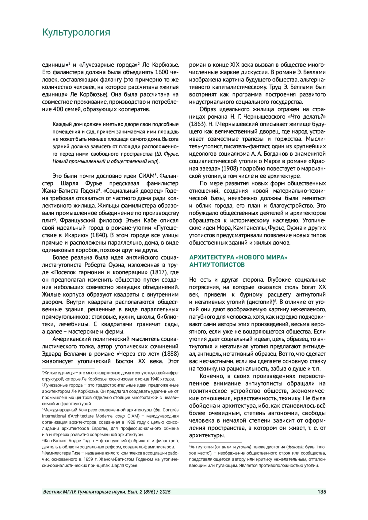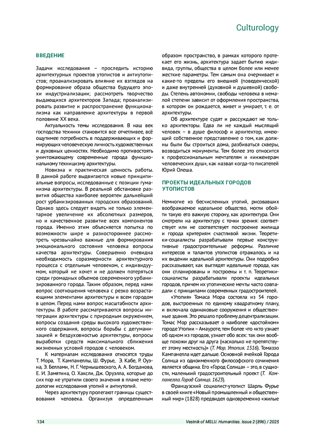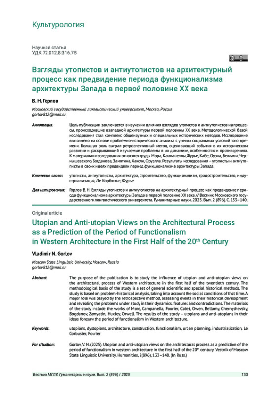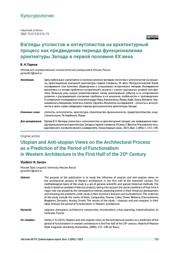 Цель публикации заключается в изучении влияния взглядов утопистов и антиутопистов на процессы, происходившие взападной архитектуры первой половины ХХ века. Методологической базой исследования стал комплекс общенаучных и специальных исторических методов. Исследование выполнено на основе проблемно-исторического анализа с учетом социальных условий того времени. Большую роль сыграл ретроспективный метод, оценивающий события в их историческом развитии и раскрывающий изучаемые проблемы в их динамике, особенностях и противоречиях. К материалам исследования относятся труды Мора, Кампанеллы, Фурье, Кабе, Оуэна, Беллами, Чернышевского, Богданова, Замятина, Хаксли, Оруэлла. Результаты исследования - утописты и антиутописты в своих идеях предвидели период функционализма архитектуры Запада.