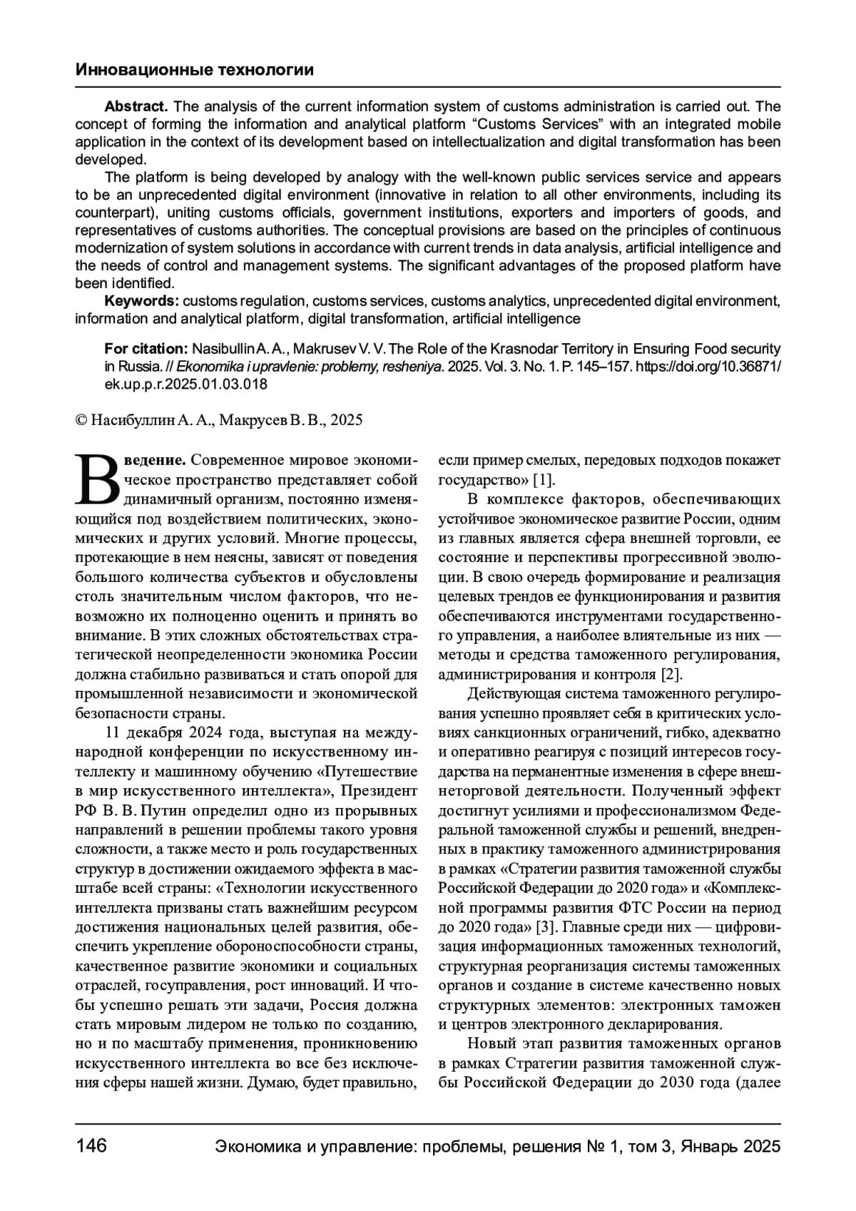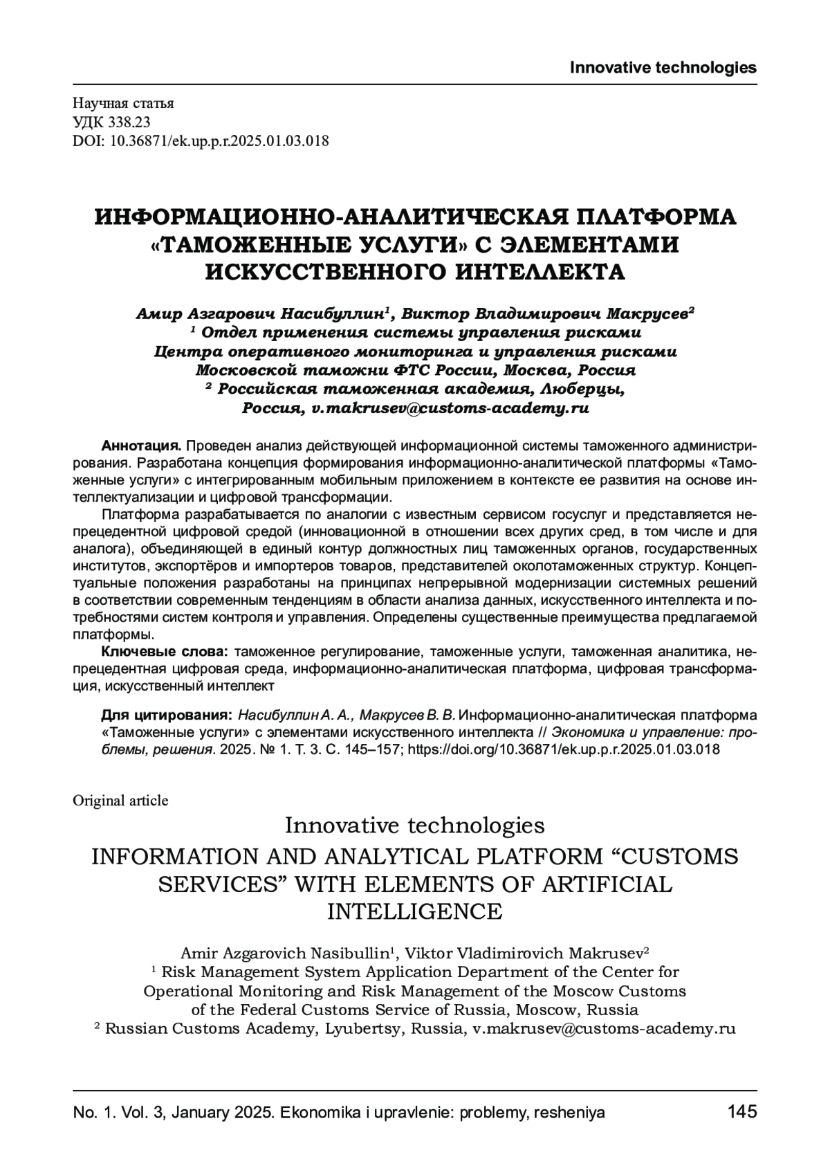 Проведен анализ действующей информационной системы таможенного администрирования. Разработана концепция формирования информационно-аналитической платформы «Таможенные услуги» с интегрированным мобильным приложением в контексте ее развития на основе интеллектуализации и цифровой трансформации. Платформа разрабатывается по аналогии с известным сервисом госуслуг и представляется непрецедентной цифровой средой (инновационной в отношении всех других сред, в том числе и для аналога), объединяющей в единый контур должностных лиц таможенных органов, государственных институтов, экспортёров и импортеров товаров, представителей околотаможенных структур. Концептуальные положения разработаны на принципах непрерывной модернизации системных решений в соответствии современным тенденциям в области анализа данных, искусственного интеллекта и потребностями систем контроля и управления. Определены существенные преимущества предлагаемой платформы.