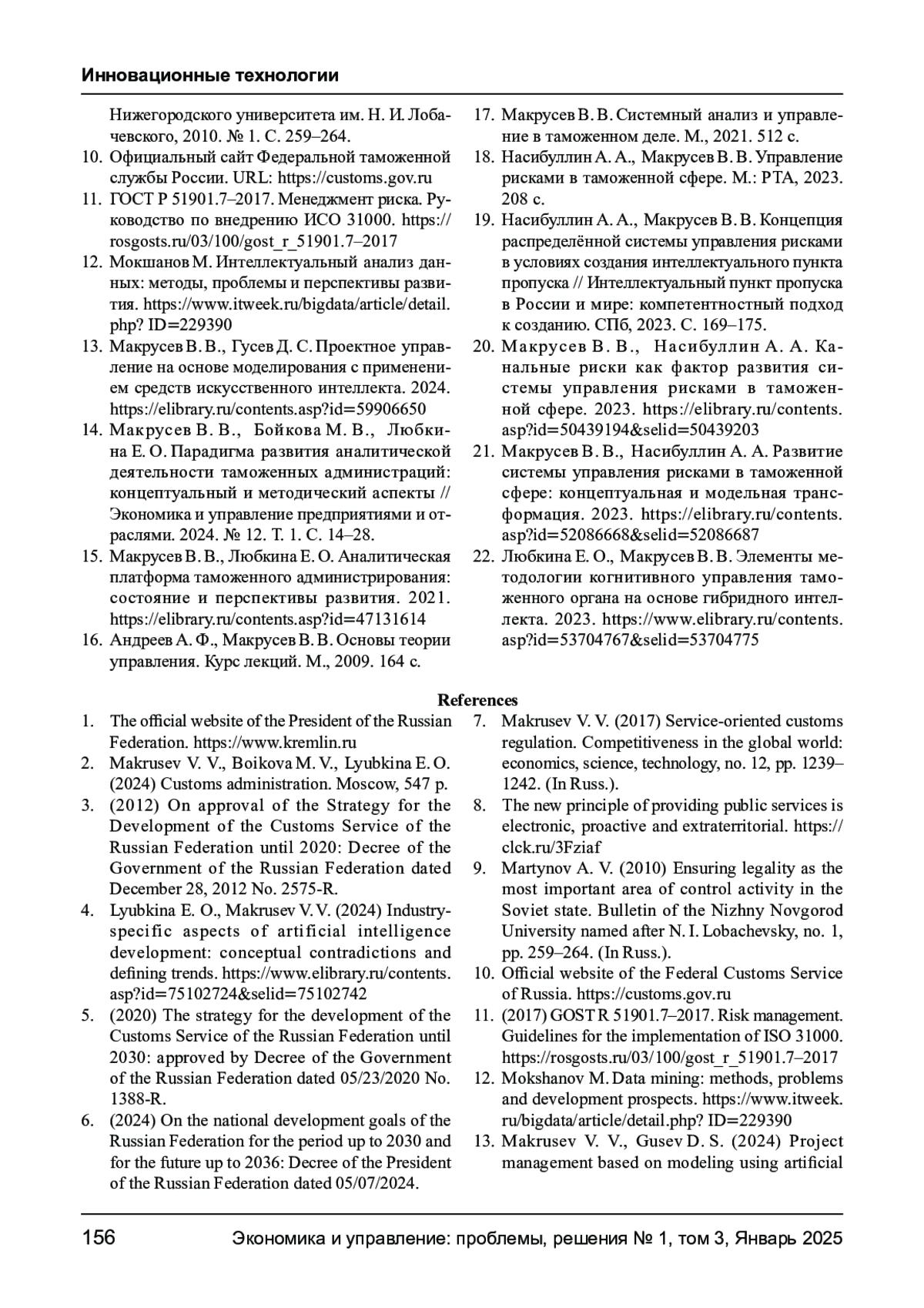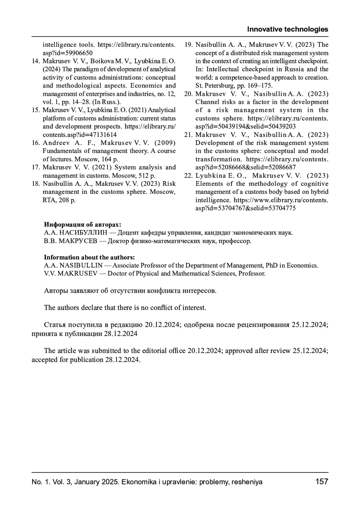 21. Макрусев В. В., Насибуллин А. А. Развитие системы управления рисками в таможенной сфере: концептуальная и модельная трансформация //Инновационное развитие экономики. 2023. № 1 (73). С. 94-105. contents.asp?id=52086668&selid=52086687. EDN: BHKXNL