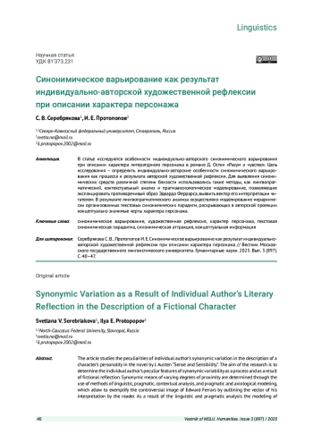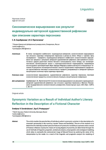 В статье исследуются особенности индивидуально-авторского синонимического варьирования при описании характера литературного персонажа в романе Д. Остин «Разум и чувство». Цель исследования - определить индивидуально-авторские особенности синонимического варьирования как процесса и результата авторской художественной рефлексии. Для выявления синонимических средств различной степени близости использовались такие методы, как лингвопрагматический, контекстуальный анализ и прагмааксиологическое моделирование, позволяющие эксплицировать противоречивый образ Эдварда Феррарса, выявить вектор его интерпретации читателем. В результате лингвопрагматического анализа осуществлено моделирование иерархически организованных текстовых синонимических парадигм, раскрывающих в авторской проекции концептуально значимые черты характера персонажа.