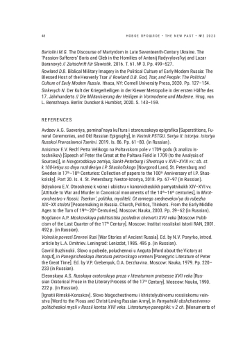 25. Bartolini M.G. The Discourse of Martyrdom in Late Seventeenth-Century Ukraine. The ‘Passion-Sufferers’ Boris and Gleb in the Homilies of Antonij Radyvylovs’kyj and Lazar Baranovyč // Zeitschrift für Slawistik. 2016. T. 61. № 3. P. 499-527. DOI: 10.1515/slaw-2016-0030