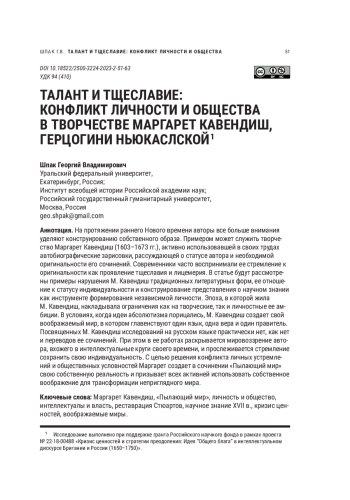 На протяжении раннего Нового времени авторы все больше внимания уделяют конструированию собственного образа. Примером может служить творчество Маргарет Кавендиш (1603–1673 гг.), активно использовавшей в своих трудах автобиографические зарисовки, рассуждающей о статусе автора и необходимой оригинальности его сочинений. Современники часто воспринимали ее стремление к оригинальности как проявление тщеславия и лицемерия. В статье будут рассмотрены примеры нарушения М. Кавендиш традиционных литературных форм, ее отношение к статусу индивидуальности и конструирование представления о научном знании как инструменте формирования независимой личности. Эпоха, в которой жила М. Кавендиш, накладывала ограничения как на творческие, так и личностные ее амбиции. В условиях, когда идеи абсолютизма порицались, М. Кавендиш создает свой воображаемый мир, в котором главенствуют один язык, одна вера и один правитель. Посвященных М. Кавендиш исследований на русском языке практически нет, как нет и переводов ее сочинений. При этом в ее работах раскрывается мировоззрение автора, вхожего в интеллектуальные круги своего времени, и прослеживается стремление сохранить свою индивидуальность. С целью решения конфликта личных устремлений и общественных условностей Маргарет создает в сочинении «Пылающий мир» свою собственную реальность и призывает всех активней использовать собственное воображение для трансформации неприглядного мира