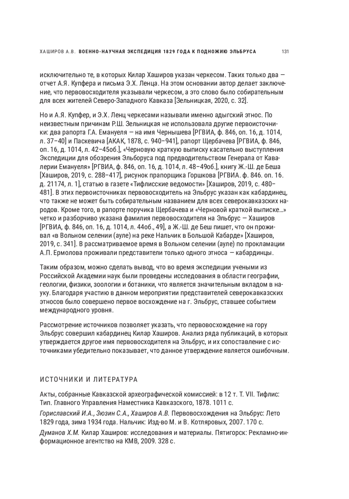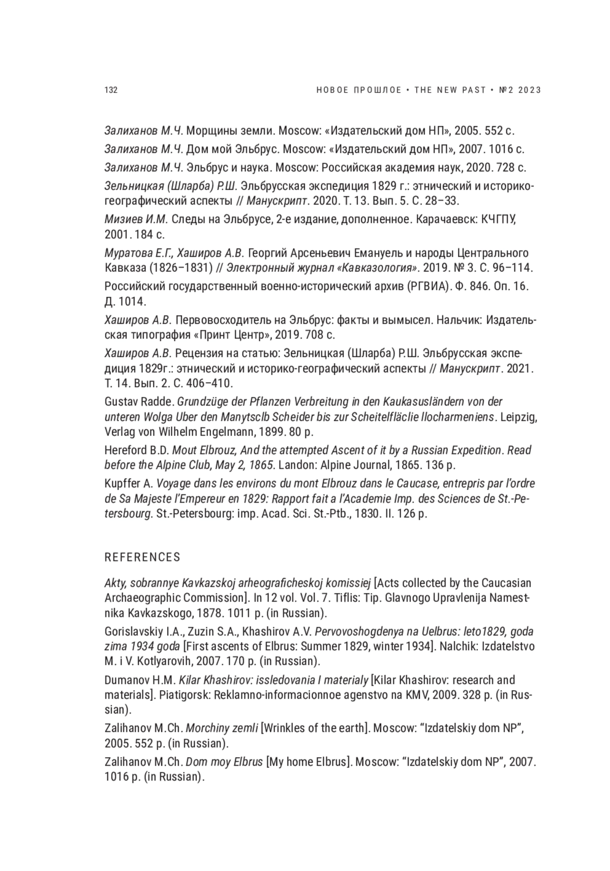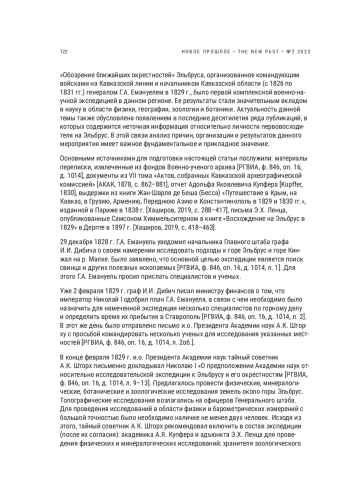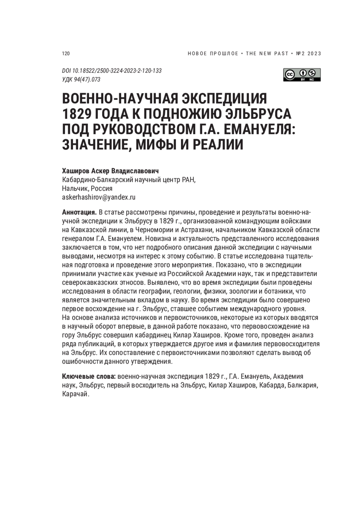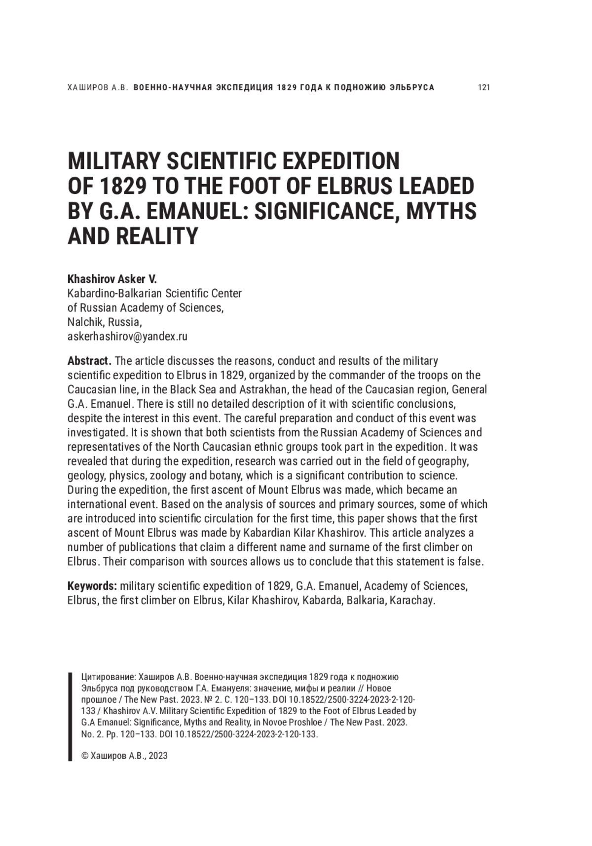 ХАШИРОВ А. В. ВОЕННО-НАУЧНАЯ ЭКСПЕДИЦИЯ 1829 ГОДА К ПОДНОЖИЮ ЭЛЬБРУСА ПОД РУКОВОДСТВОМ Г. А. ЕМАНУЕЛЯ: ЗНАЧЕНИЕ, МИФЫ И РЕАЛИИ // НОВОЕ ПРОШЛОЕ. 2023. № 2