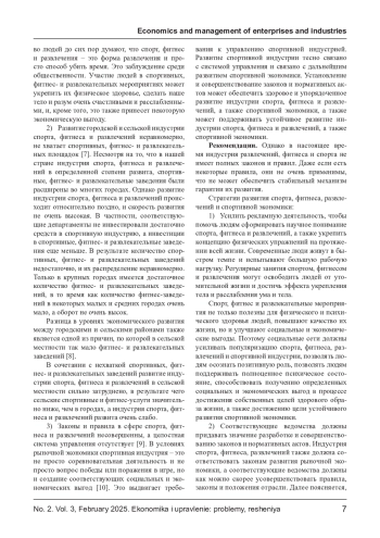 Статья посвящена анализу роли фитнес-индустрии в создании рабочих мест и поддержке малого предпринимательства. В работе рассматриваются механизмы, развития отрасли, включая государственную поддержку, цифровую трансформацию и современные бизнес-модели. В исследовании применяются статистический анализ, сравнительный подход, а также обзор современных экономических моделей управления фитнес-бизнесом. Авторы используют данные официальных источников, научных публикаций и отраслевой аналитики. Основные результаты исследования показывают, что фитнес-индустрия - важный источник занятости, обеспечивающий рабочими местами тренеров, административного персонала, маркетологов и специалистов в области цифровых технологий. Малый бизнес в этой сфере характеризуется высокой адаптивностью и гибкостью в реагировании на изменения рынка. Государственная поддержка в виде льготного налогообложения, субсидий и образовательных программ направлена на увеличение числа малых предприятий в фитнес-индустрии, за счет привлечения инвестиций в развитие спортивной инфраструктуры. Цифровизация влияет на развитие отрасли путем внедрения CRM-систем, онлайн-курсов, мобильных приложений и персонализированных тренировочных программ, оптимизируя управление бизнесом, расширяя клиентскую аудиторию и повышая конкурентоспособность организаций. В перспективе ожидается усиление роли цифровых технологий, развитие гибридных бизнес-моделей и расширение государственной поддержки, которые приведут к росту рынка фитнес-услуг.