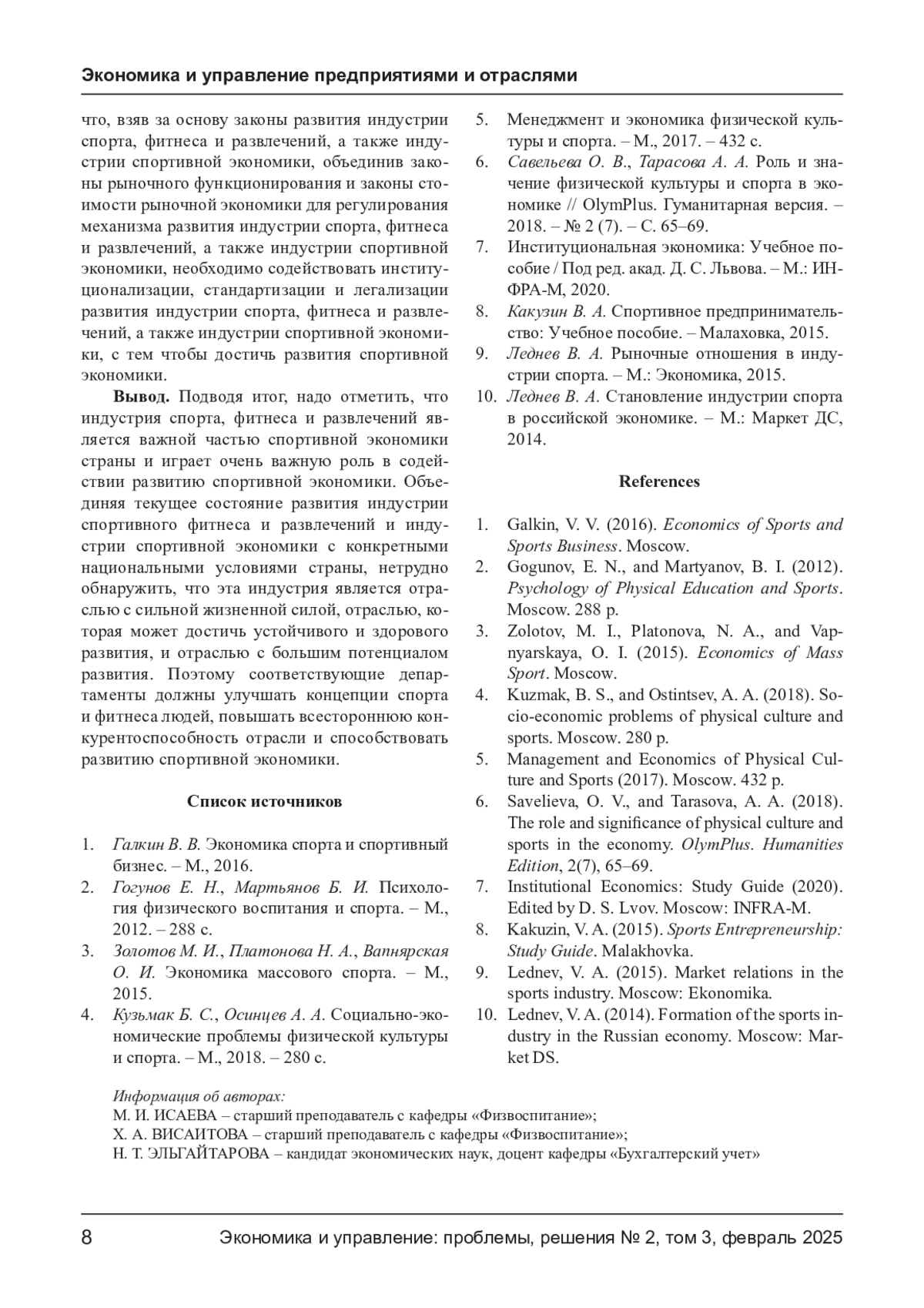 1. Галкин В. В. Экономика спорта и спортивный бизнес. - М., 2016.