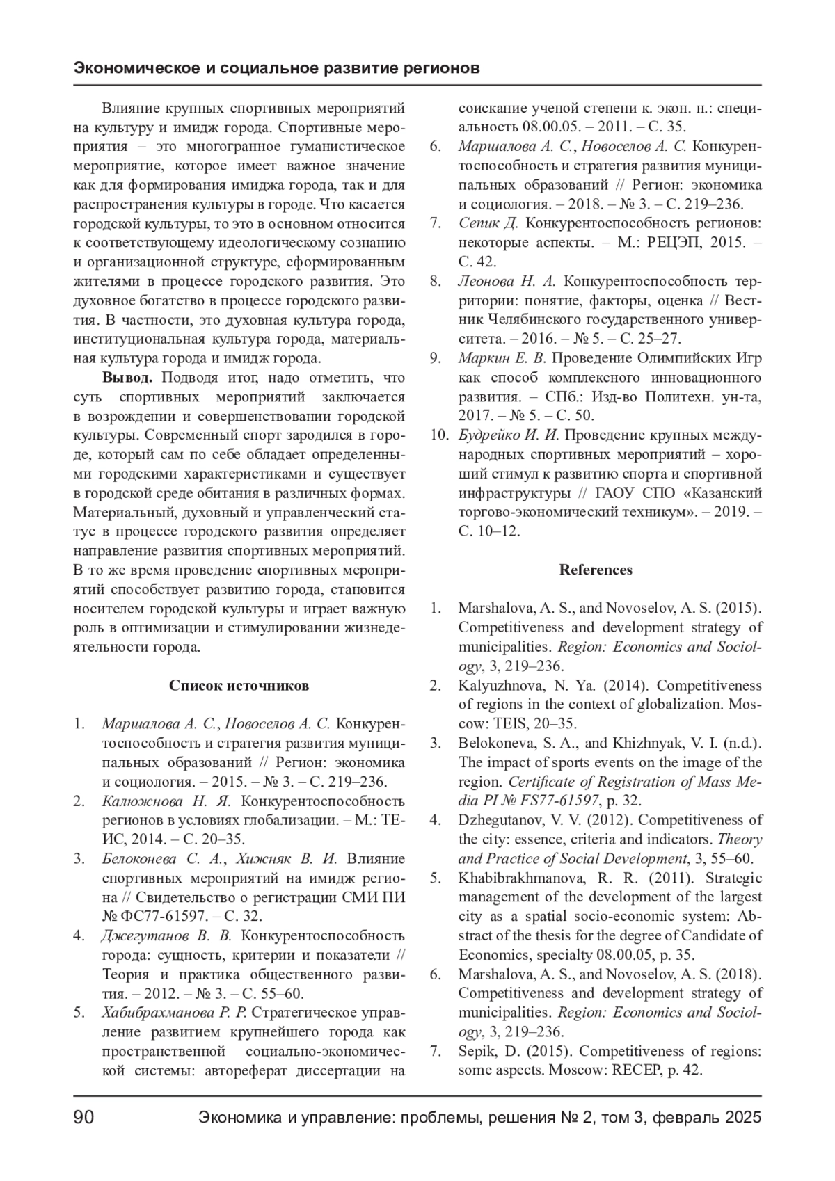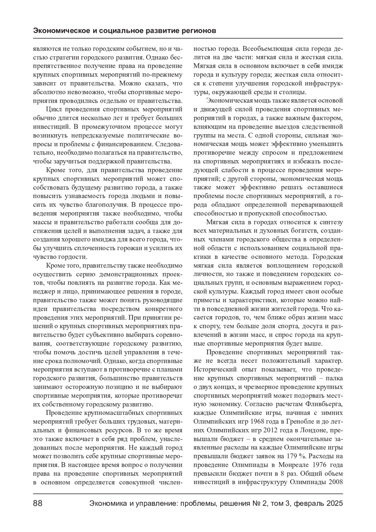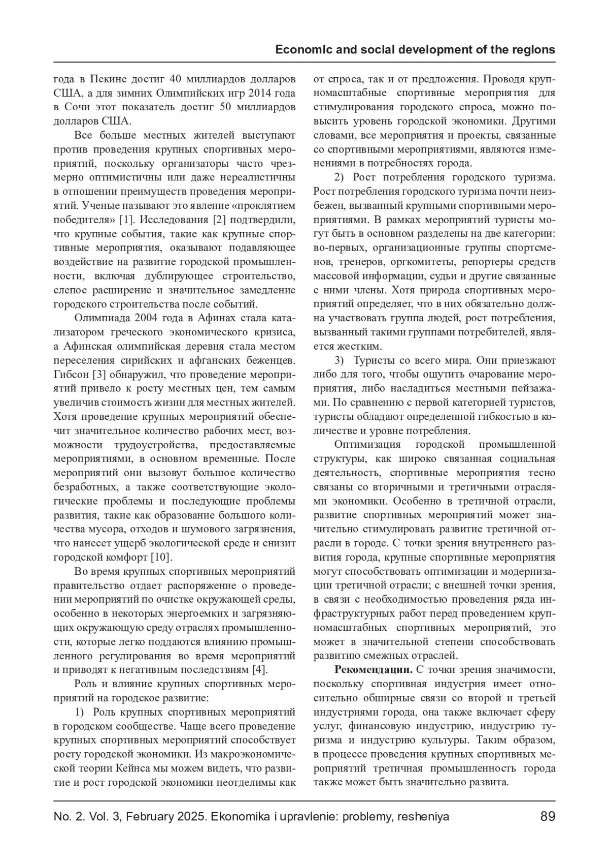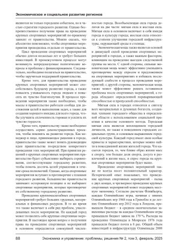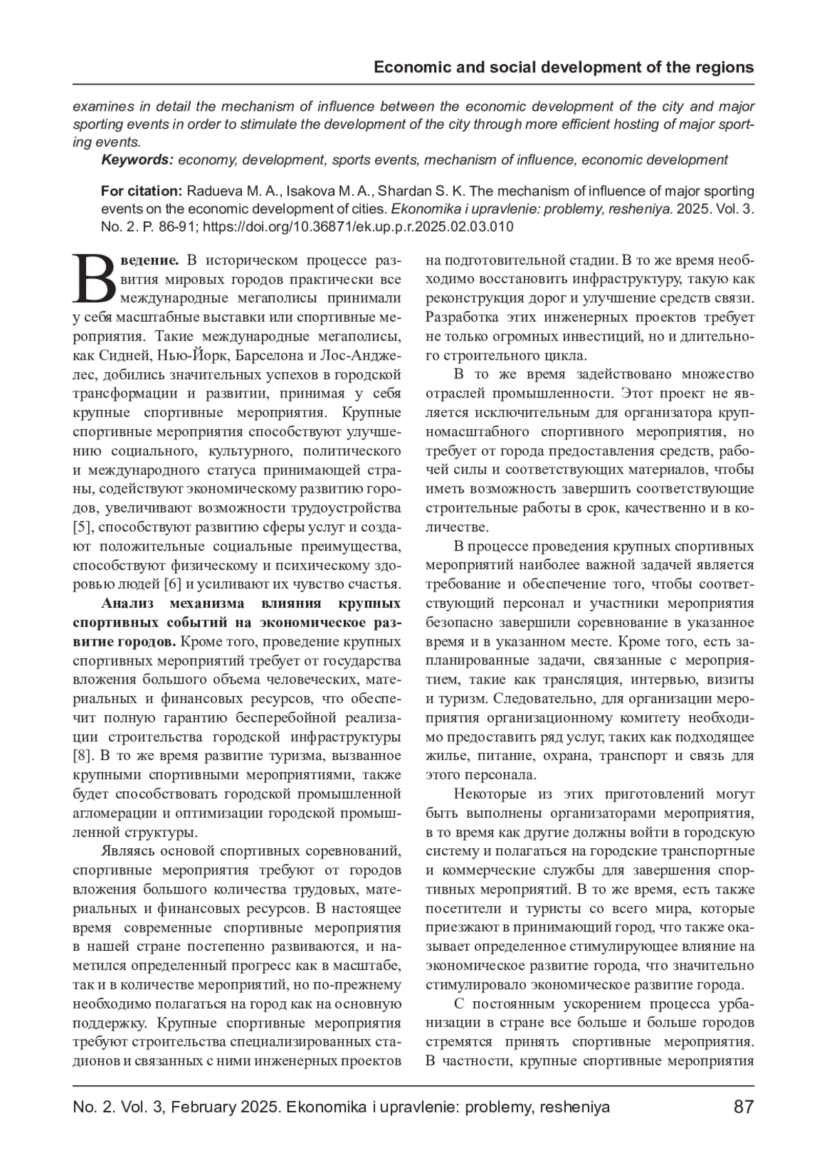 РАДУЕВА М. А., ИСАКОВА М. А., ШАРДАН С. К. МЕХАНИЗМ ВЛИЯНИЯ КРУПНЫХ СПОРТИВНЫХ СОБЫТИЙ НА ЭКОНОМИЧЕСКОЕ РАЗВИТИЕ ГОРОДОВ // ЭКОНОМИКА И УПРАВЛЕНИЕ: ПРОБЛЕМЫ, РЕШЕНИЯ. 2025. ТОМ 3 № 2