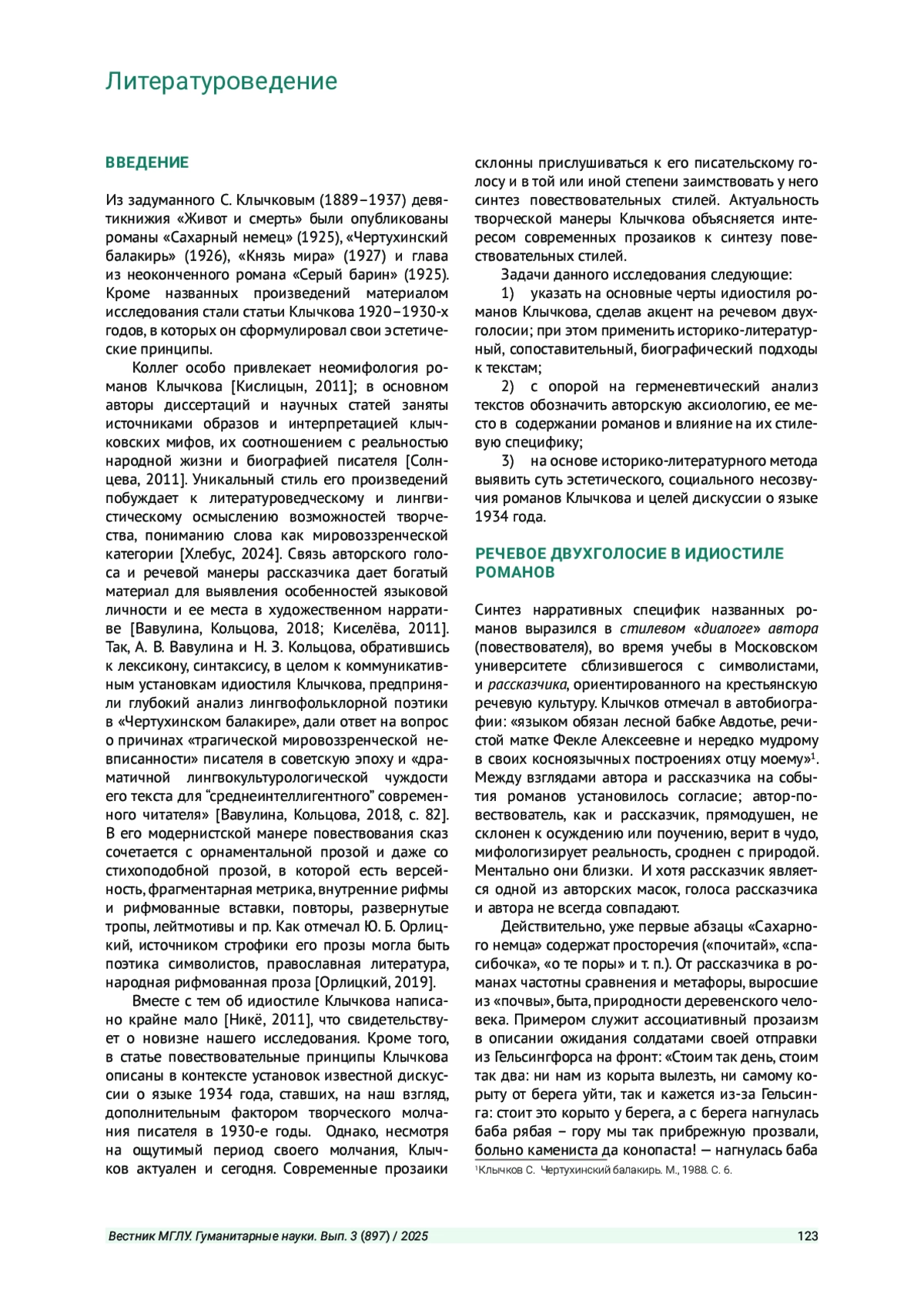 4. Вавулина А. В., Кольцова Н. З. Языковая личность рассказчика в романе С. Клычкова “Чертухинский балакирь” // Язык, литература, культура. Актуальные проблемы изучения и преподавания. 2018. Вып. 14. С. 81-100.