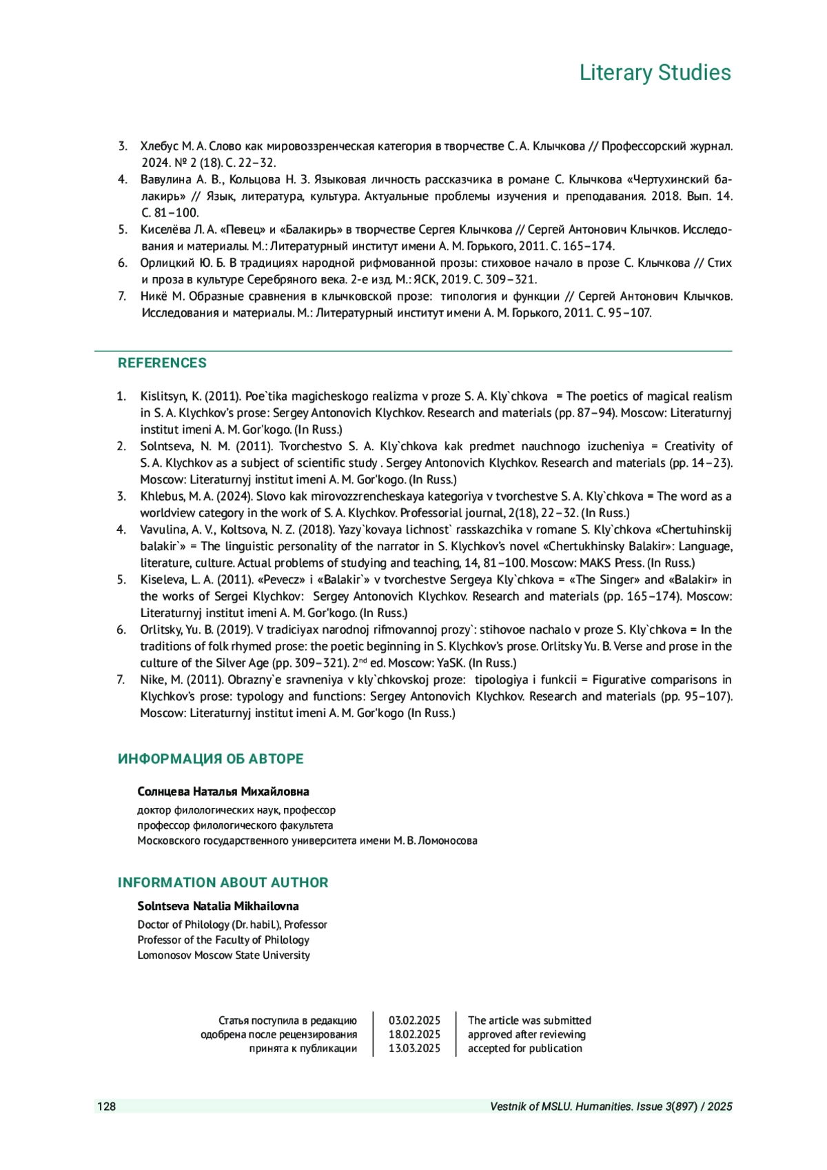 7. Никё М. Образные сравнения в клычковской прозе: типология и функции // Сергей Антонович Клычков. Исследования и материалы. М.: Литературный институт имени А. М. Горького, 2011. С. 95-107.