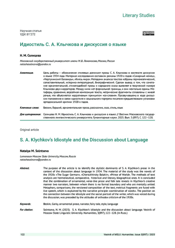 Цель работы - обозначение стилевых доминант прозы С. А. Клычкова в контексте дискуссии о языке 1934 года. Материал исследования составили романы 1920-х годов «Сахарный немец», «Чертухинский балакирь», «Князь мира». Методами анализа текстов избраны герменевтический, сопоставительный, историко-литературный, биографический. Сделан вывод о том, что сочетание орнаментальной, стихоподобной прозы и народного сказа выявляет в творческой манере Клычкова двух нарраторов. Между ними нет формальной границы, и они ментально едины. Метафоры, сравнения, версейная композиция текста, метрические фрагменты сплавлены с живой речью, что объясняется нарративным принципом «со-словия». Прозвучавшему в ходе дискуссии положению о связи идиостиля и социального портрета писателя предшествовали установки ортодоксальной критики 1920-х годов.