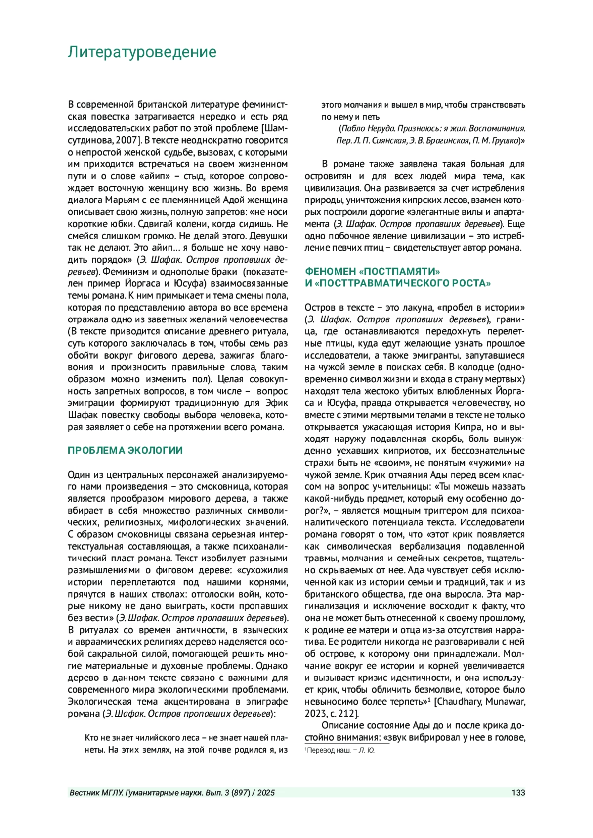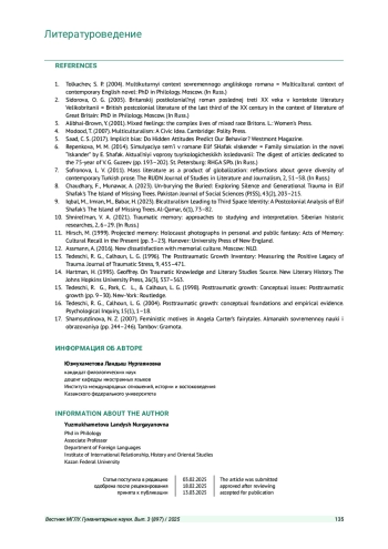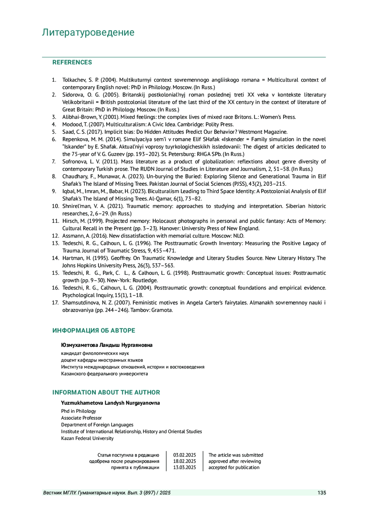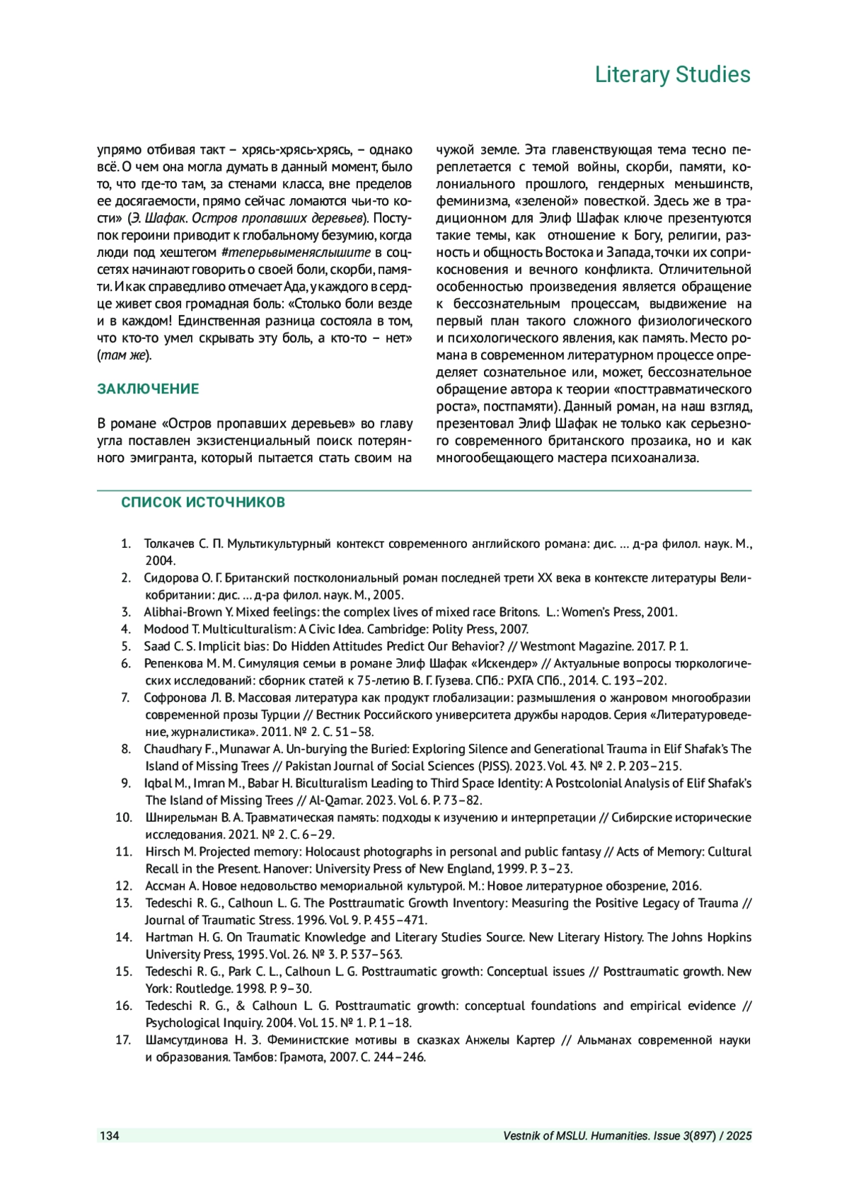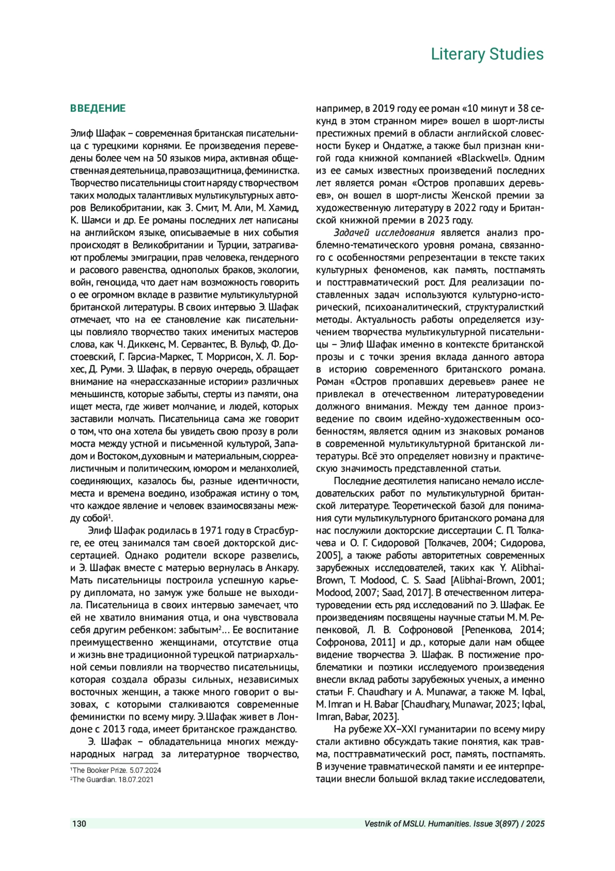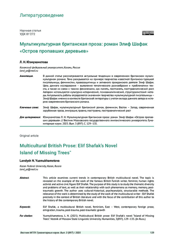 ЮЗМУХАМЕТОВА Л. Н. МУЛЬТИКУЛЬТУРНАЯ БРИТАНСКАЯ ПРОЗА: РОМАН ЭЛИФ ШАФАК «ОСТРОВ ПРОПАВШИХ ДЕРЕВЬЕВ» // ВЕСТНИК МОСКОВСКОГО ГОСУДАРСТВЕННОГО ЛИНГВИСТИЧЕСКОГО УНИВЕРСИТЕТА. ГУМАНИТАРНЫЕ НАУКИ. 2025. № 3 (897)