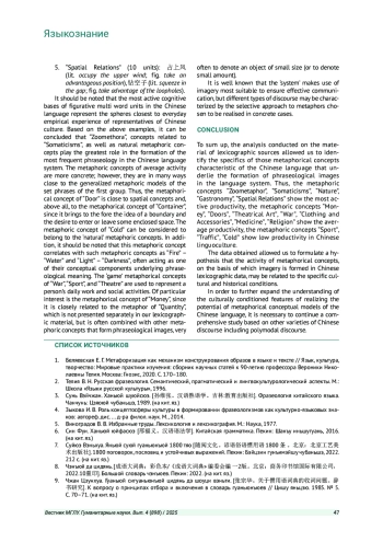 This article is devoted to the consideration of metaphoric concepts that underlie the formation of phraseological units of the Chinese language, with special reference to their classification and the degree of their activity in the language system. First, it seems necessary to conduct a theoretical review of the scientific literature on the issue under study and clarify the conceptual and terminological apparatus, which includes such concepts as “metaphoric concept”, as well as various approaches to identifying different types of phraseological units.