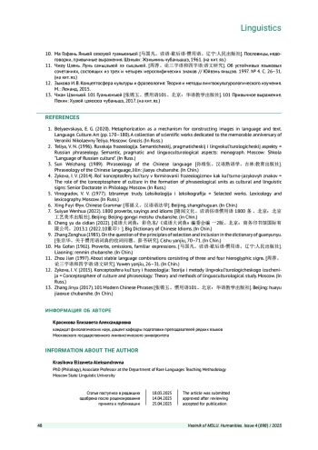 4. Зыкова И. В. Роль концептосферы культуры в формировании фразеологизмов как культурно-языковых знаков: автореф. дис.. д-ра филол. наук. М., 2014. EDN: ZPGELX