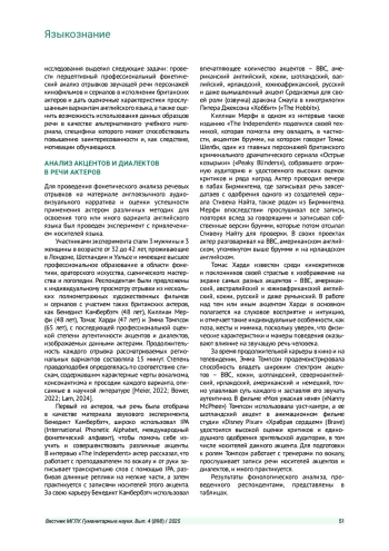 Статья: РЕГИОНАЛЬНЫЕ АКЦЕНТЫ В СЦЕНИЧЕСКОЙ РЕЧИ (НА МАТЕРИАЛЕ СОВРЕМЕННОГО БРИТАНСКОГО КИНЕМАТОГРАФА) (2025)