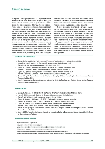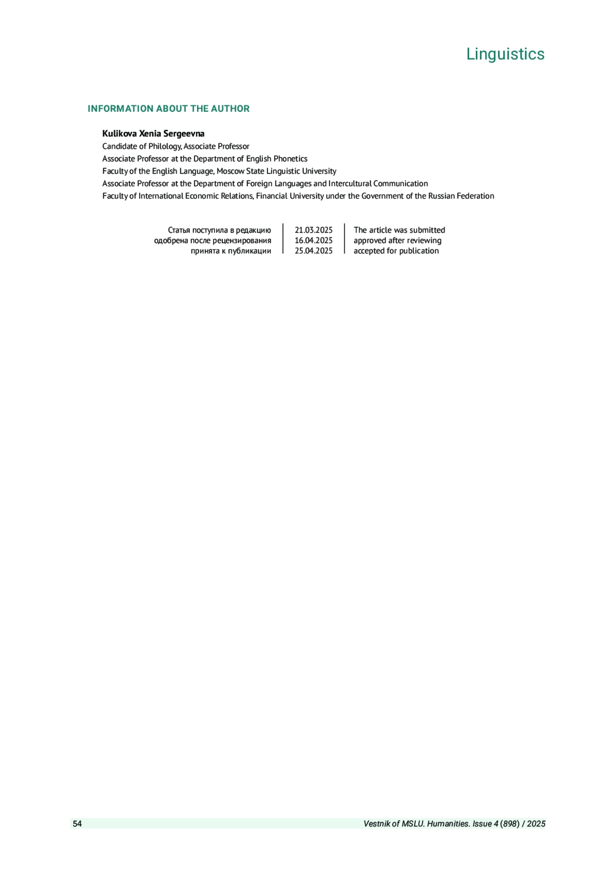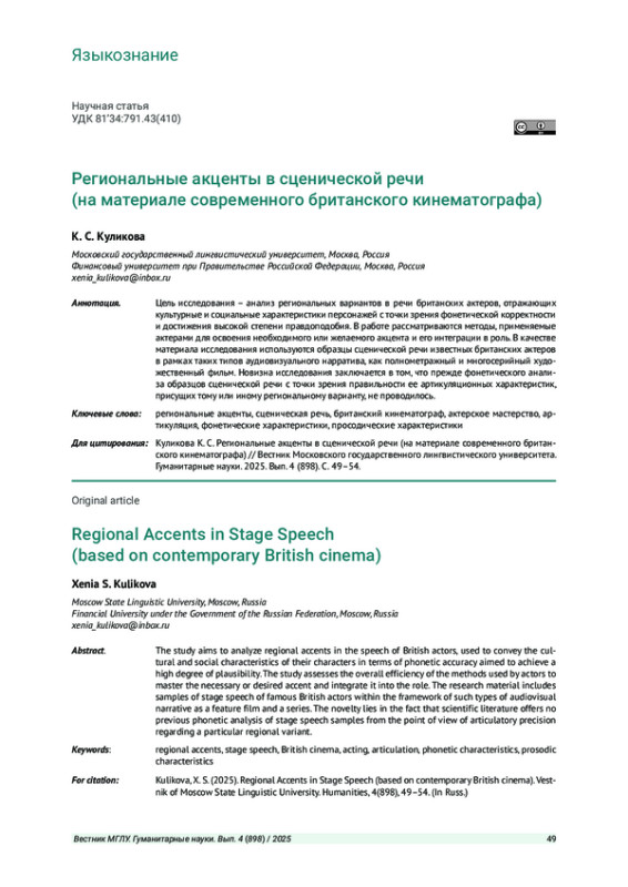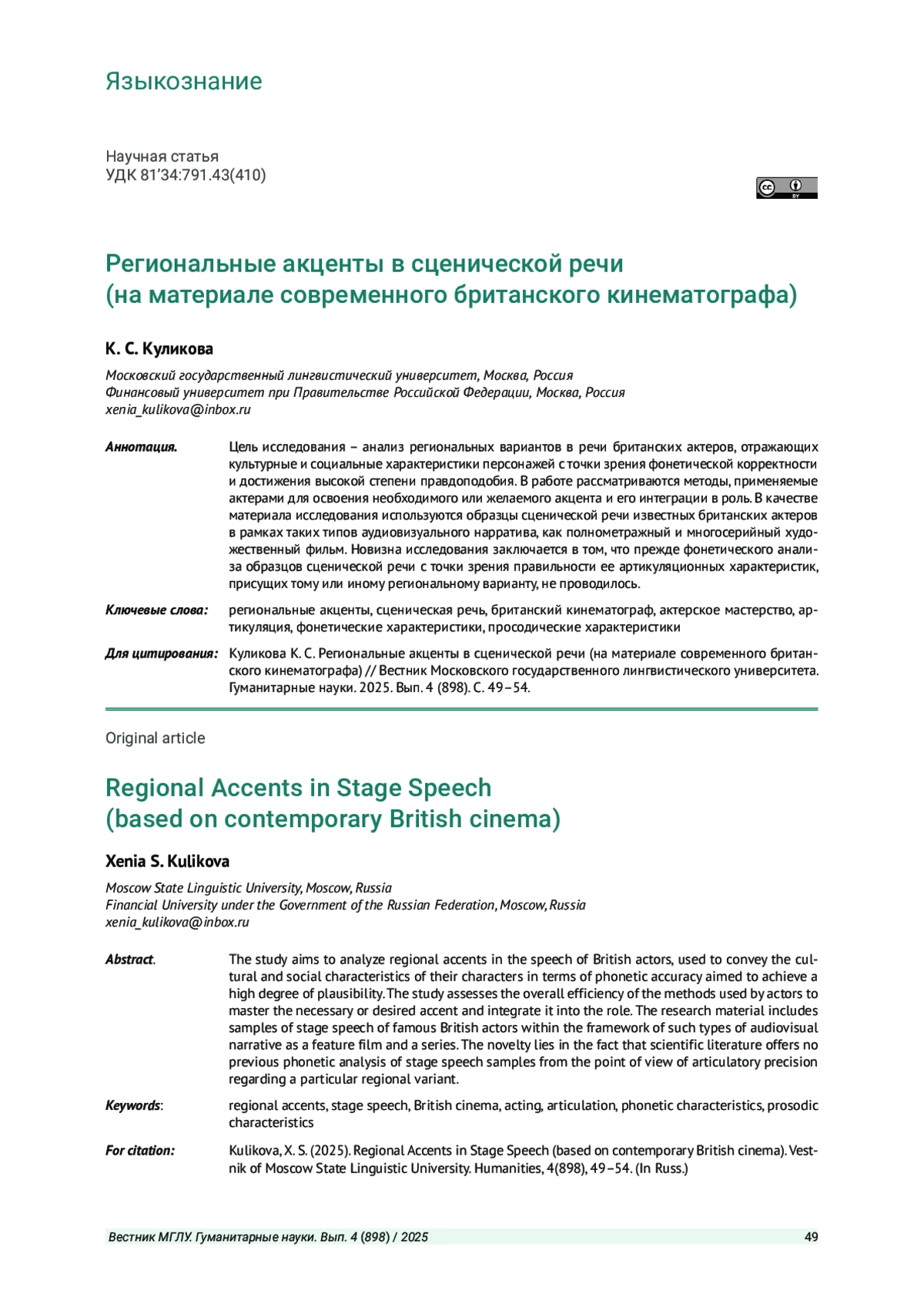 КУЛИКОВА К. С. РЕГИОНАЛЬНЫЕ АКЦЕНТЫ В СЦЕНИЧЕСКОЙ РЕЧИ (НА МАТЕРИАЛЕ СОВРЕМЕННОГО БРИТАНСКОГО КИНЕМАТОГРАФА) // ВЕСТНИК МОСКОВСКОГО ГОСУДАРСТВЕННОГО ЛИНГВИСТИЧЕСКОГО УНИВЕРСИТЕТА. ГУМАНИТАРНЫЕ НАУКИ. 2025. № 4 (898)
