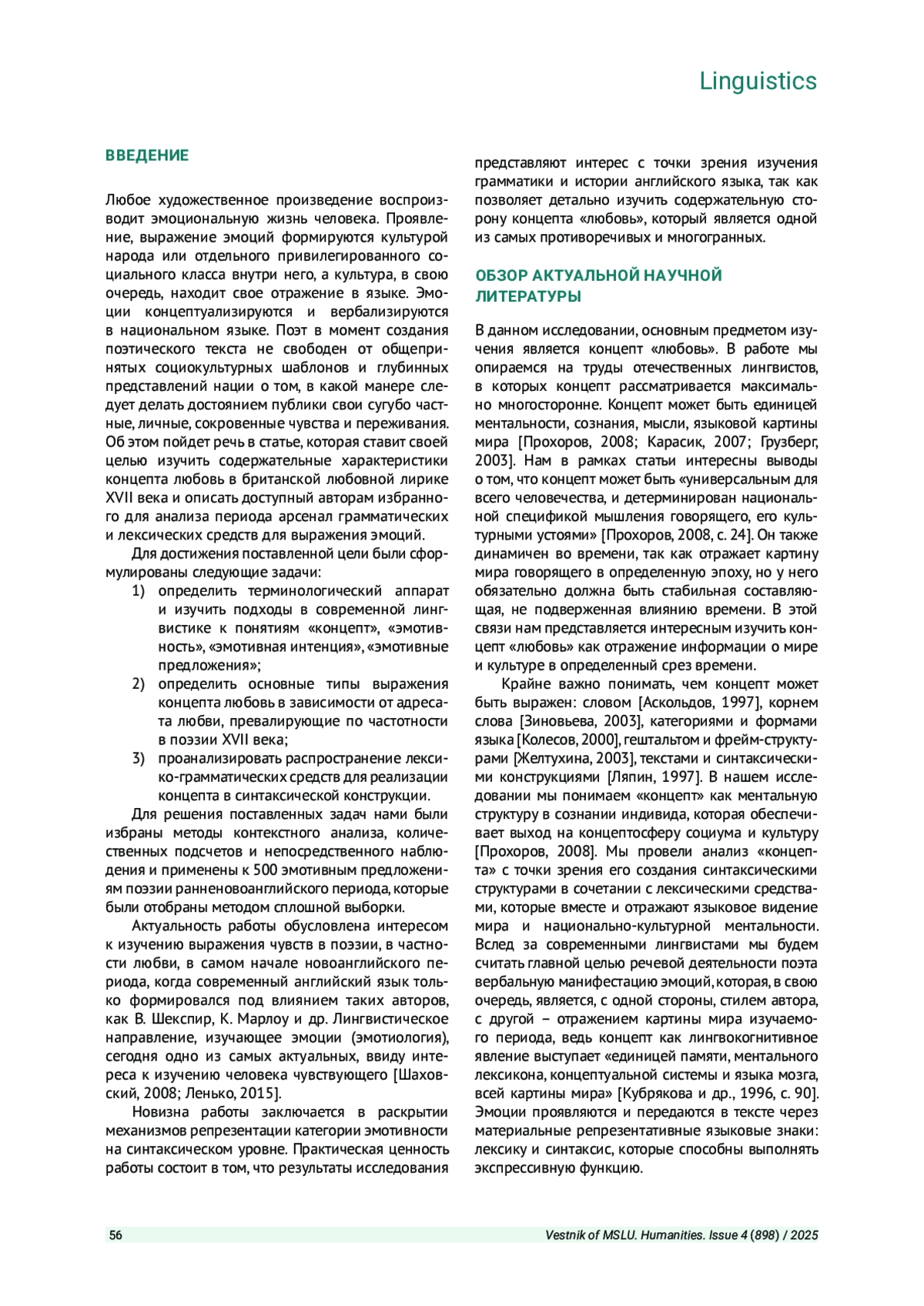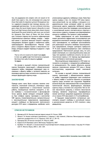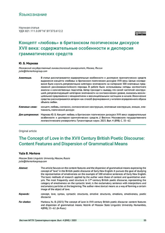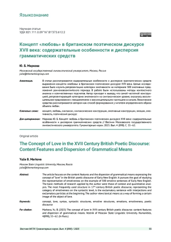 МАРКОВА Ю. Б. КОНЦЕПТ «ЛЮБОВЬ» В БРИТАНСКОМ ПОЭТИЧЕСКОМ ДИСКУРСЕ XVII ВЕКА: СОДЕРЖАТЕЛЬНЫЕ ОСОБЕННОСТИИ ДИСПЕРСИЯ ГРАММАТИЧЕСКИХ СРЕДСТВ // ВЕСТНИК МОСКОВСКОГО ГОСУДАРСТВЕННОГО ЛИНГВИСТИЧЕСКОГО УНИВЕРСИТЕТА. ГУМАНИТАРНЫЕ НАУКИ. 2025. № 4 (898)
