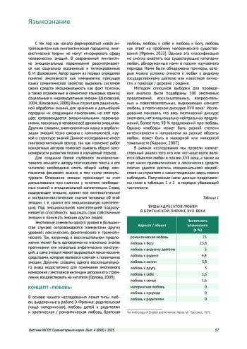 Статья: КОНЦЕПТ «ЛЮБОВЬ» В БРИТАНСКОМ ПОЭТИЧЕСКОМ ДИСКУРСЕ XVII ВЕКА: СОДЕРЖАТЕЛЬНЫЕ ОСОБЕННОСТИИ ДИСПЕРСИЯ ГРАММАТИЧЕСКИХ СРЕДСТВ (2025)