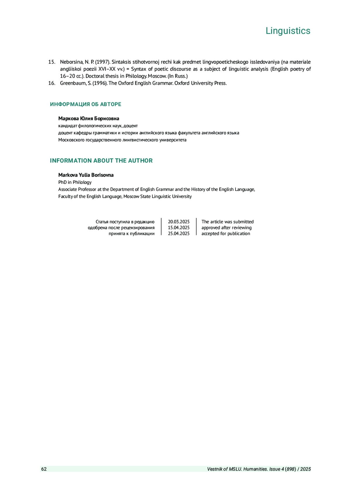 Журнал: ВЕСТНИК МОСКОВСКОГО ГОСУДАРСТВЕННОГО ЛИНГВИСТИЧЕСКОГО УНИВЕРСИТЕТА. ГУМАНИТАРНЫЕ НАУКИ