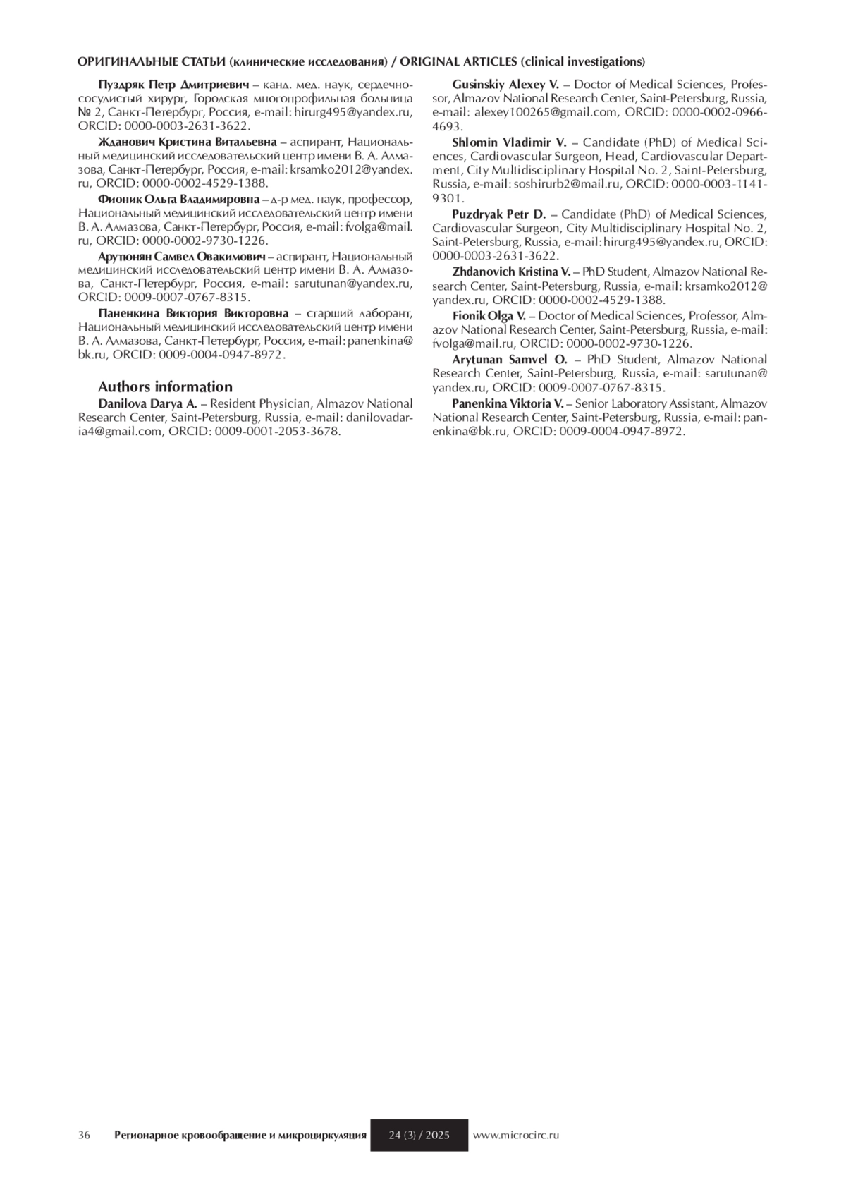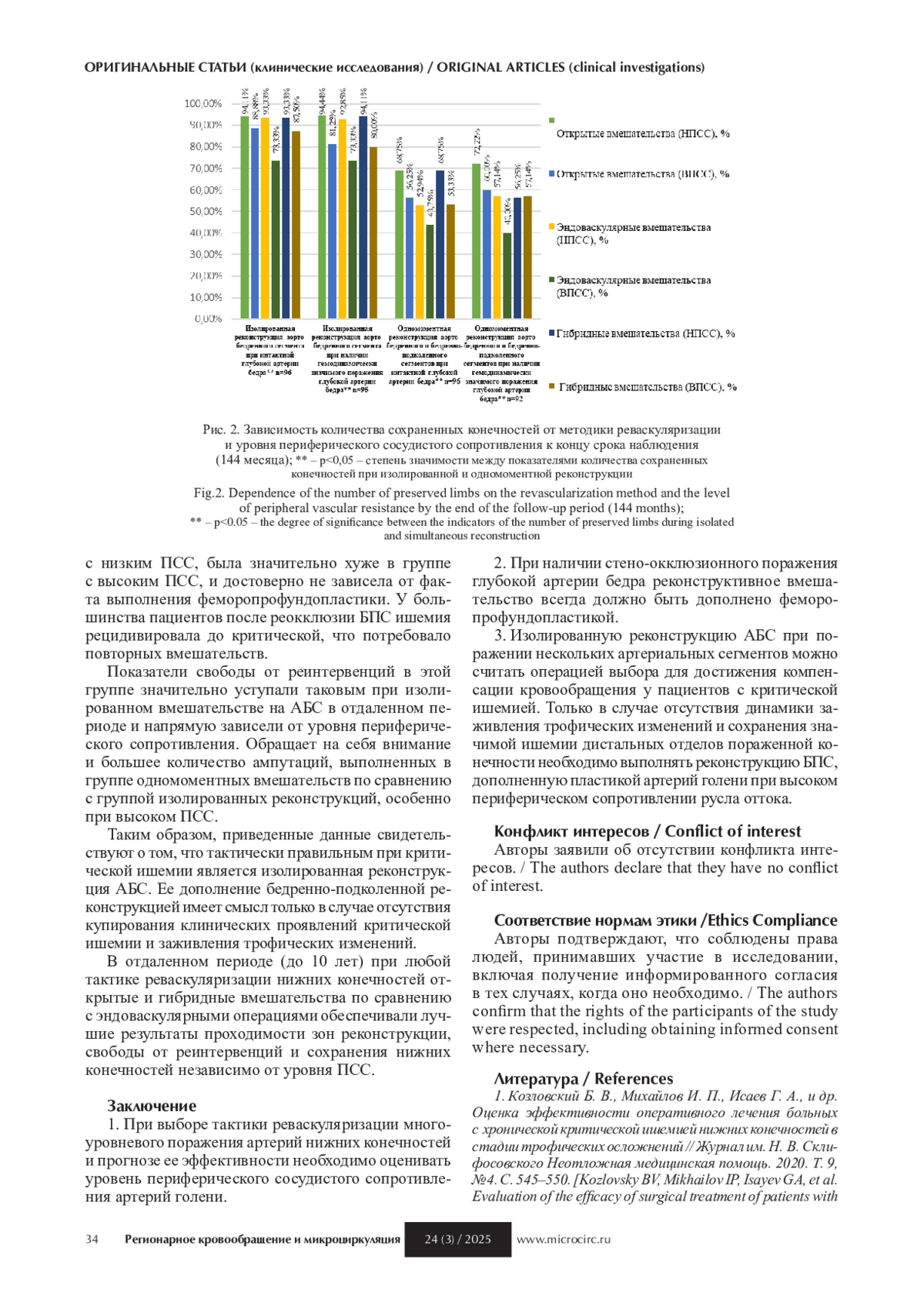ДАНИЛОВА Д. А., ГУСИНСКИЙ А. В., ШЛОМИН В. В., ПУЗДРЯК П. Д., ЖДАНОВИЧ К. В., ФИОНИК О. В., АРУТЮНЯН С. О., ПАНЕНКИНА В. В. ВЫБОР ОПТИМАЛЬНОЙ ТАКТИКИ ХИРУРГИЧЕСКОГО ЛЕЧЕНИЯ ПРИ МНОГОУРОВНЕВЫХ ПОРАЖЕНИЯХ АРТЕРИЙ НИЖНИХ КОНЕЧНОСТЕЙ У ПАЦИЕНТОВ С КРИТИЧЕСКОЙ ИШЕМИЕЙ В ЗАВИСИМОСТИ ОТ УРОВНЯ ПЕРИФЕРИЧЕСКОГО СОСУДИСТОГО СОПРОТИВЛЕНИЯ И СОСТОЯНИЯ ГЛУБОКОЙ АРТЕРИИ БЕДРА // РЕГИОНАРНОЕ КРОВООБРАЩЕНИЕ И МИКРОЦИРКУЛЯЦИЯ. 2025. № 3 (95), ТОМ 24