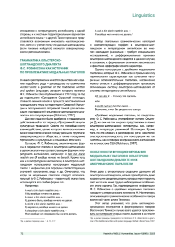 Цель исследования - оценить, в какой мере конструкции с множественными модальными глаголами и аналитические формы модальных глаголов в ольстерско-шотландском диалекте освещаются в справочно-учебных грамматиках и могут ли данные феномены рассматриваться как дифференциальные признаки системы этого идиома. Материалом исследования послужили грамматики и описания шотландского языка, при этом, в качестве основного источника была отобрана работа Ф. С. Робинсона «Ulster-Scots: a grammar of the traditional written and spoken language». Использовались методы наблюдения, описания, сравнения, а также элементы количественного и качественного контент-анализа. Результаты исследования: конструкции с множественными модальными глаголами (might could do и др.) и аналитические формы модальных глаголов являются элементами системы и дифференциальными признаками описываемого идиома, а также могут быть охарактеризованы как шотландизмы. Они присутствуют в обиходной речи, но в языке литературы представлены слабо.