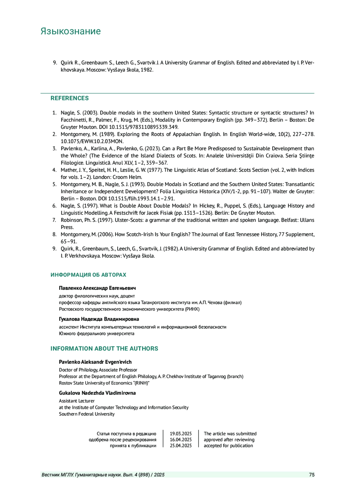 5. Montgomery M. B., Nagle S. J. Double Modals in Scotland and the Southern United States: Transatlantic Inheritance or Independent Development? // Folia Linguistica Historica XIV/1-2. Walter de Gruyter: Berlin - Boston. 1993. P. 91-107.