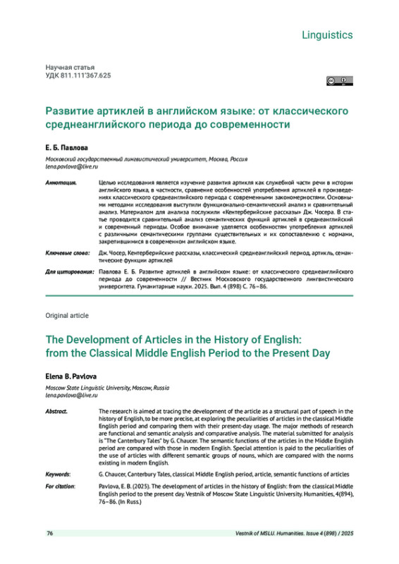 Целью исследования является изучение развития артикля как служебной части речи в истории английского языка, в частности, сравнение особенностей употребления артиклей в произведениях классического среднеанглийского периода с современными закономерностями. Основными методами исследования выступили функционально-семантический анализ и сравнительный анализ. Материалом для анализа послужили «Кентерберийские рассказы» Дж. Чосера. В статье проводится сравнительный анализ семантических функций артиклей в среднеанглийский и современный периоды. Особое внимание уделяется особенностям употребления артиклей с различными семантическими группами существительных и их сопоставлению с нормами, закрепившимися в современном английском языке.