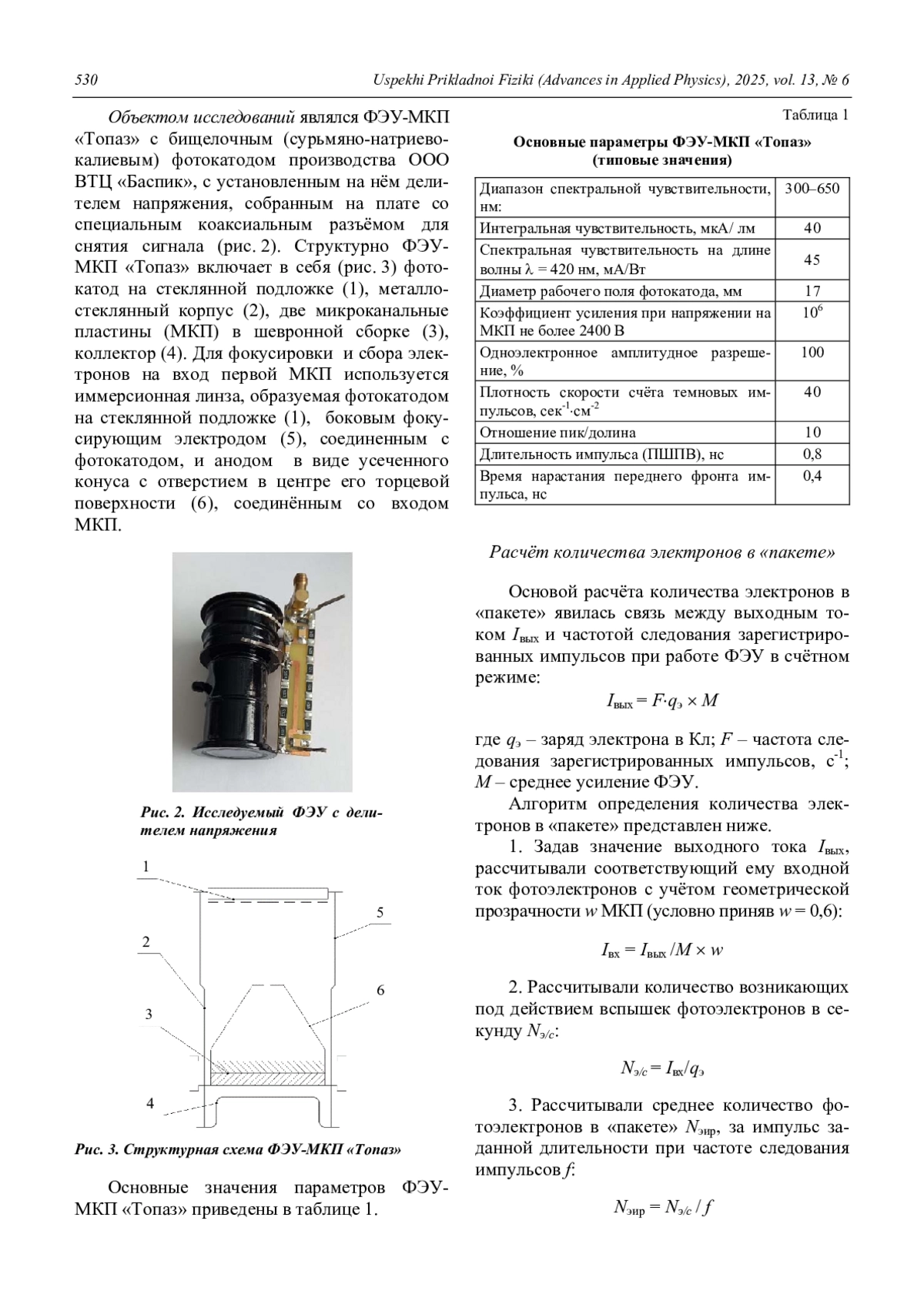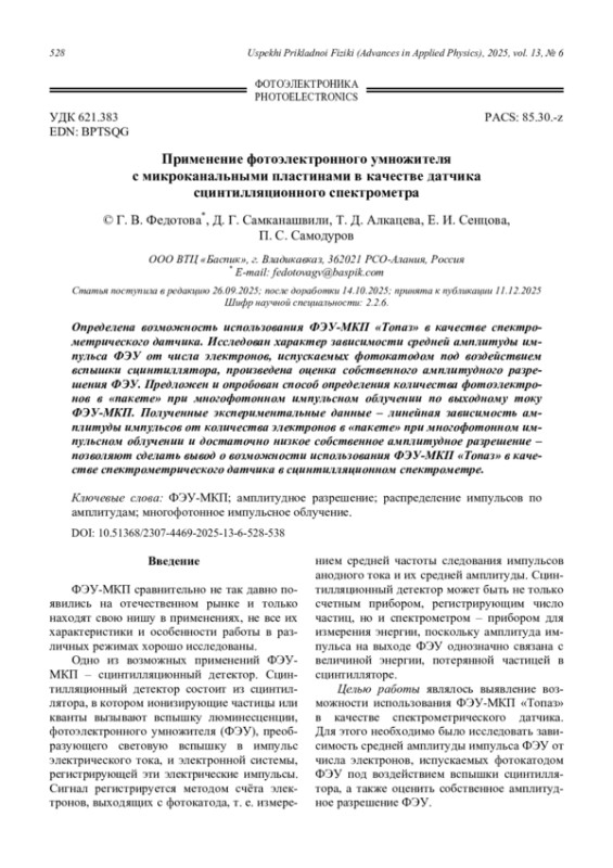 Определена возможность использования ФЭУ-МКП «Топаз» в качестве спектрометрического датчика. Исследован характер зависимости средней амплитуды импульса ФЭУ от числа электронов, испускаемых фотокатодом под воздействием вспышки сцинтиллятора, произведена оценка собственного амплитудного разрешения ФЭУ. Предложен и опробован способ определения количества фотоэлектронов в «пакете» при многофотонном импульсном облучении по выходному току ФЭУ-МКП. Полученные экспериментальные данные – линейная зависимость амплитуды импульсов от количества электронов в «пакете» при многофотонном импульсном облучении и достаточно низкое собственное амплитудное разрешение – позволяют сделать вывод о возможности использования ФЭУ-МКП «Топаз» в качестве спектрометрического датчика в сцинтилляционном спектрометре.