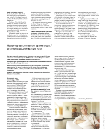 В разделе новостей говорится о теме Всемирного дня архитектуры 2025 года, назначении бывшего президента МСА Гаэтана Сью послом Маврикия в Китае, а также представлены победители конкурса Kaira Looro-2025.